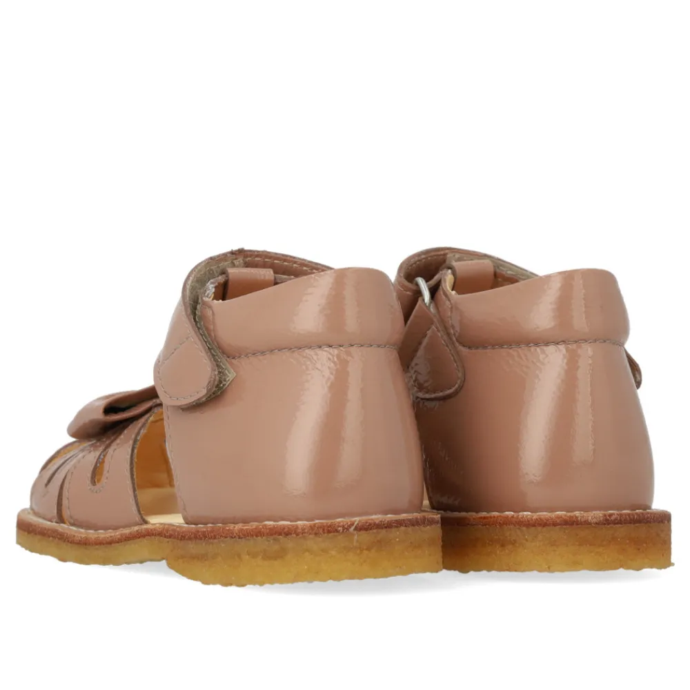 Begyndersandal med sløjfe og justerbar velcro. Lukket tå og fast hælkappe for maksimal støtte.