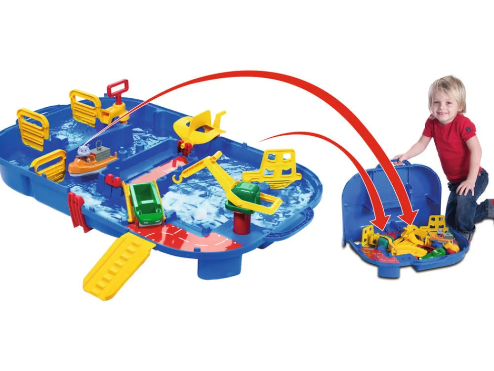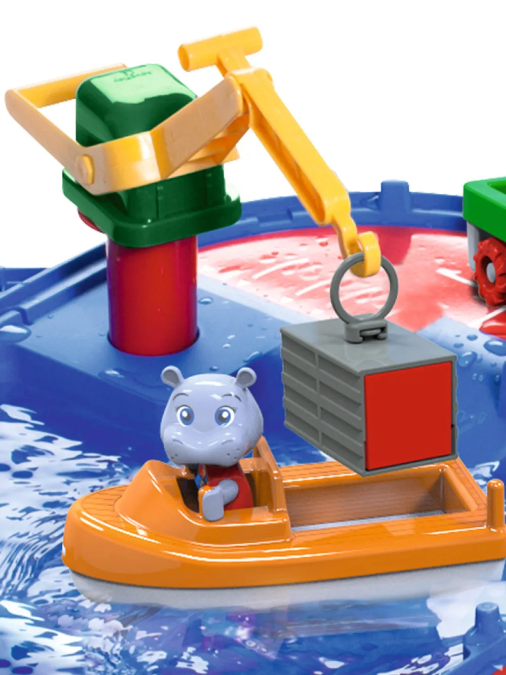 AquaPlay LockBox er nem at tage med sig og kan forlænges. 25 dele inkl. 1 containerskib, 1 amfibiebil og figuren flodhesten Wilma. Mål: 85×65 cm. Fra 3 år. Produceret i Tyskland.