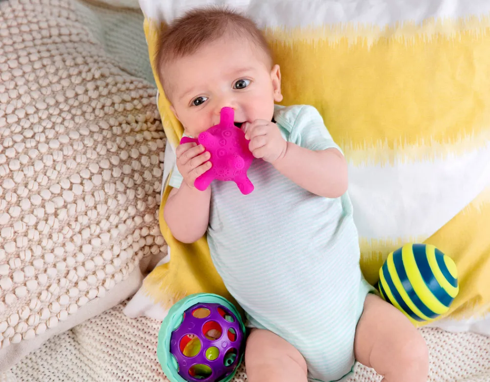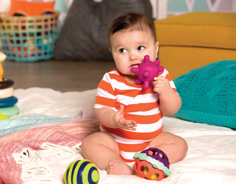 Den ujævne lyser når den bliver kastet med, den stibede har squeaker lyd, den kantede er perfekt til at bide og gumle i og den hullede er super til små hænder at gribe fat i.