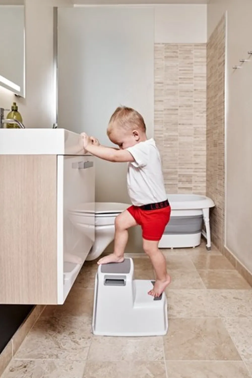 Two Step Stool by BabyDan gør det nemt for små størrelser at nå køkkenbordet, når der skal laves mad, eller vasken, når tænderne skal børstes. Skamlen har skridsikkert materiale på både trin og under bunden, og er 26 cm. høj. 35 cm. bred og 30 cm. i længden
