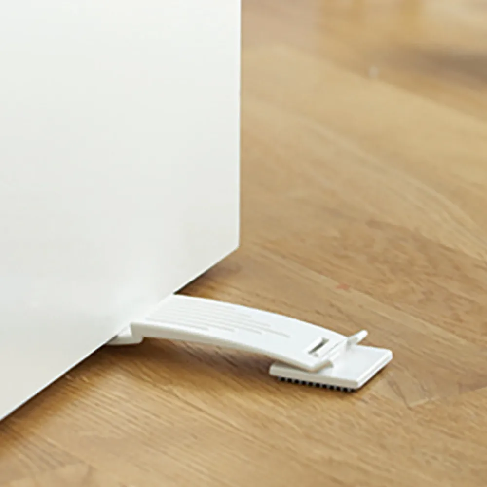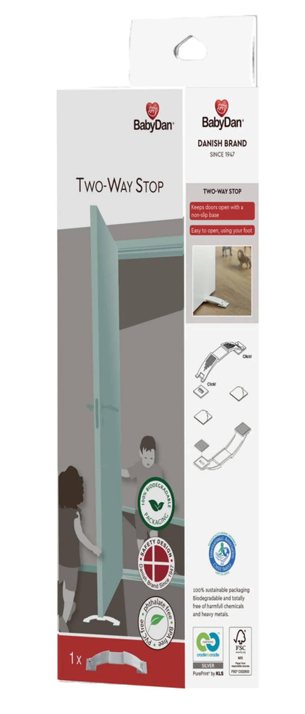 2-vejs dørstop. Sikrer at en åben dør ikke uforsætligt smækkes i. Forhindrer at små børn får deres finger i klemme i døre, der smækker i. Udstyret med gummipuder, der gør, at dørstopperen både virker både på trægulv og gulvtæpper. Testet fri for giftige stoffer som ftalater, BPA og PVC. Emballagen er 100% biologisk nedbrydelig, Cradle to Cradle cerfificeret .