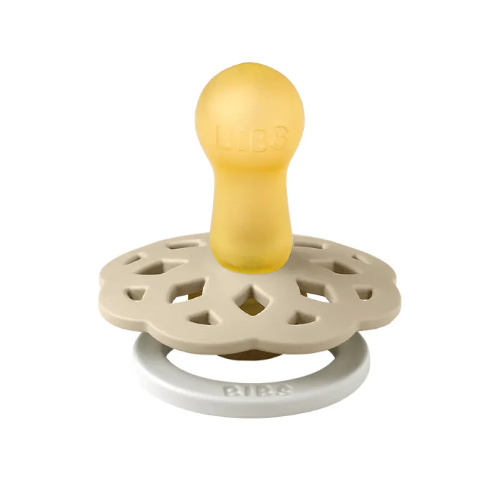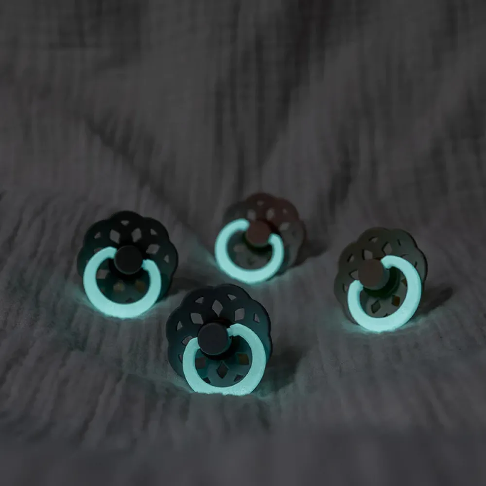 BIBS Boheme GLOW har samme høje kvalitet, som de originale BIBS-sutter, men har en praktisk selvlysende effekt. Effekten gør det nemt for både forældre og små at finde sutterne i mørke. Hold blot sutten op til en lyskilde i 5-10 sek. for at aktivere effekten. Nipplen er lavet af naturgummilatex. BIBS Boheme-sutten har en romantisk og kunstnerisk silhuet, der er inspireret af naturen. Det runde sutte hoved fremmer en lignende tunge placering og suge teknik som ved amning. Sutten er udstyret med en ventil, der slipper luft ud, når barnet lukker sutten. Dette ventilationssystem får luften inde fra sutten til at blive skubbet ud gennem ventilen og derved flade sutten ud for at forme sig naturligt efter babyens mundhule. Ventilen er også grunden til, at vand kan komme ind i sutten efter rengøring og sterilisering – hvis dette er tilfældet, skal du bare klemme sutten flad for at presse det overskydende vand ud. Det runde lette skjold vender væk fra barnets følsomme og sarte hud omkring munden for at sikre minimal kontakt med næse og mund, hvilket betyder mindre chance for fugtophobning fra spyt, der kan forårsage udslæt og ømme pletter.