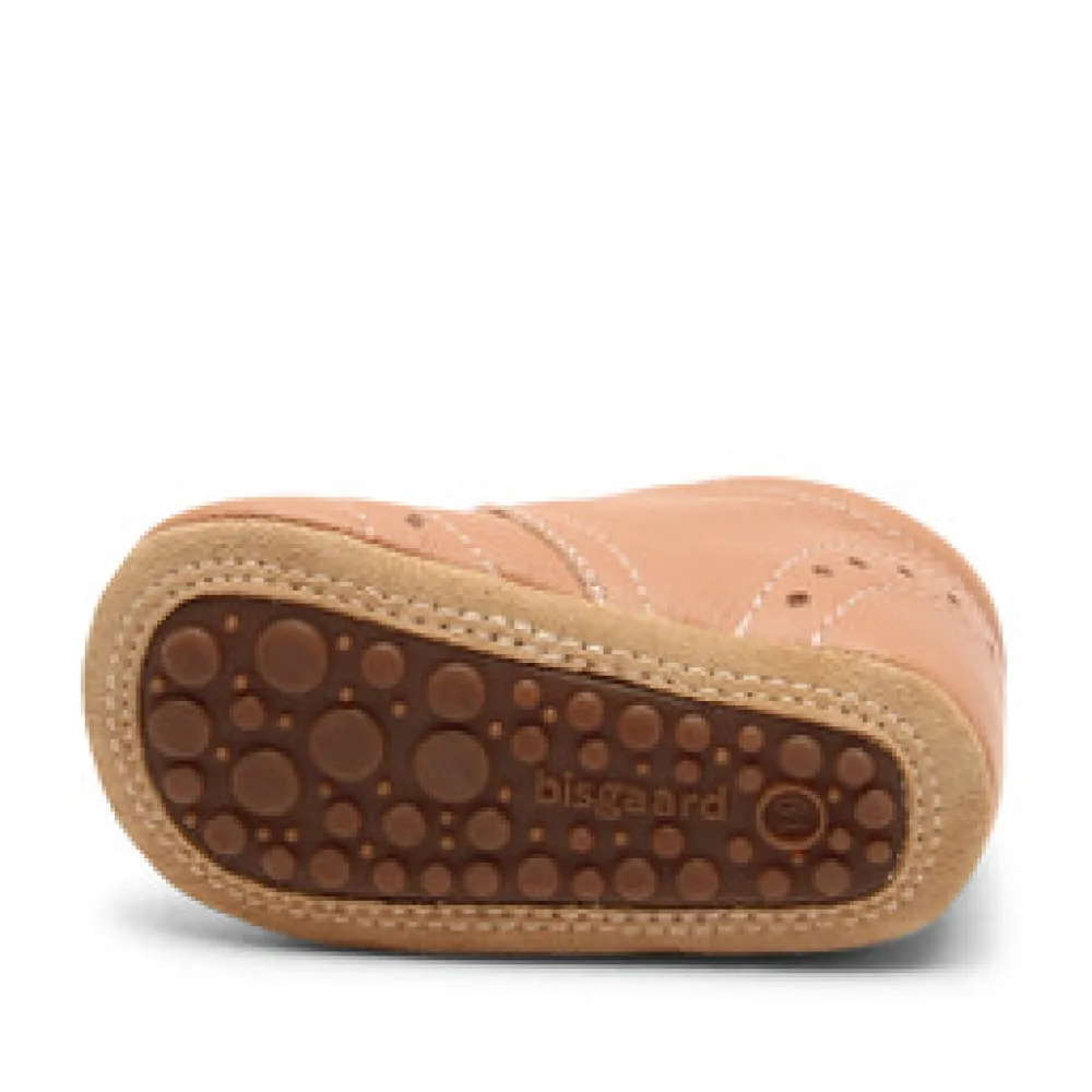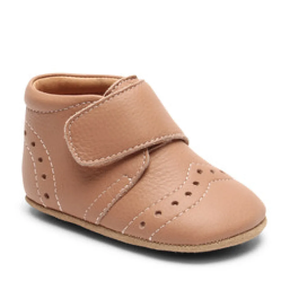 Hjemmesko, som også kan bruges som prewalker med velcrolukning, skindfoer og en blød sål af ruskind og skridsikker gummi, der giver den optimale støtte. Hjemmeskoen er produceret i 100% naturligt og åndbart læder, der er lukket rundt om foden og samtidig giver foden plads til at vokse.