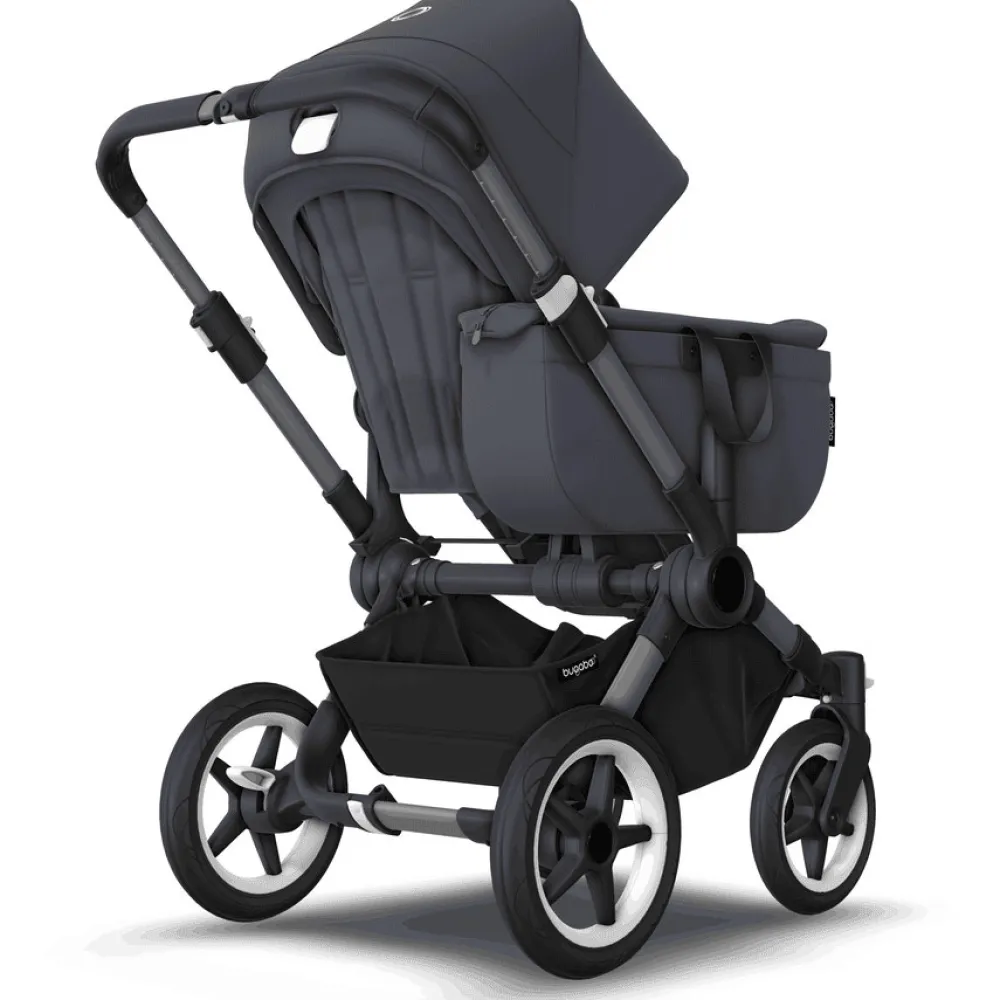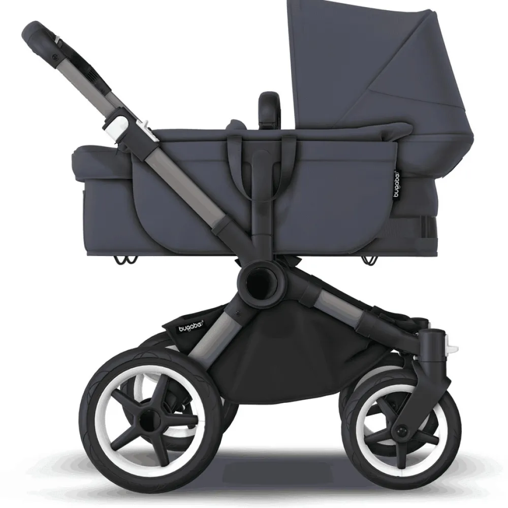 Med denne Bugaboo Donkey5 er der ekstra opbevaring lige ved siden af sædet, så man nemt kan komme til sin taske, og have varekurven fri til indkøb. Varekurven er god rummelig, har ekstra små lommer og er godkendt til 10 kg. Styret har teleskop styr, som nemt justeres i højden, og tilpasses “føreren” af vognen. Med de drejbare forhjul, er det en vogn som er let at køre med, og hvis turen går til mere ujævn terræn f.eks. skoven, er de lige til at låse. Med de skumfyldte hjul og gode affjedring, gør det turen behagelig og komfortabel for både barnet og forældrene. Der er mulighed for at tilkøbe adapter, så de fleste babyautostole nemt klikkes på stellet. Når det ekstra sæde anvendes kan den ekstra opbevaringskurv ikke bruges!