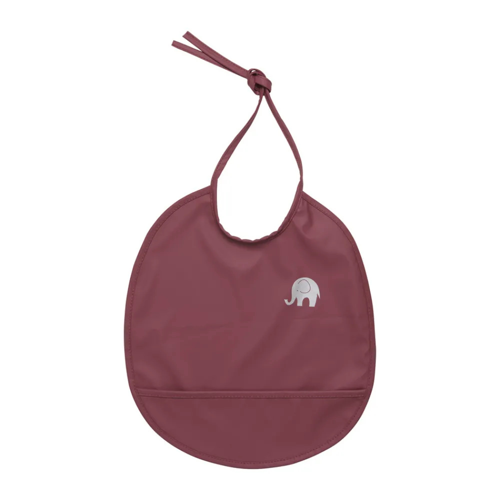 Rund, bred og praktisk hagesmæk fra CeLaVi. Åbnes og lukkes med bindebånd i nakken. Gummibelagt forside gør det nemt at tørre den af efter spisning. Materiale: 38% polyurethane – 62% polyester. Hagesmækken er uden flourstoffer.