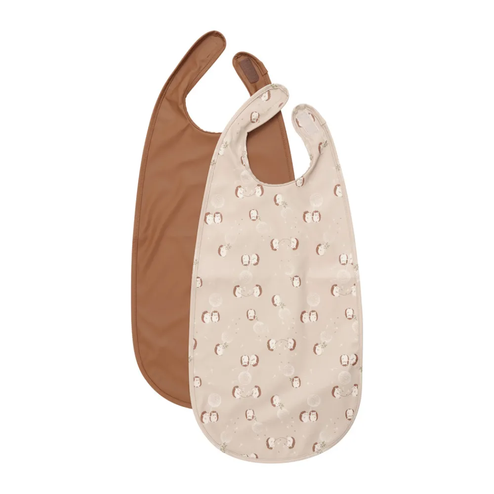 2-pak lange hagesmække i PU fra CeLaVi. Hagesmækken lukkes med velcro bagpå. Pakken består af en hagesmæk med all-over print og i ensfarvet.
