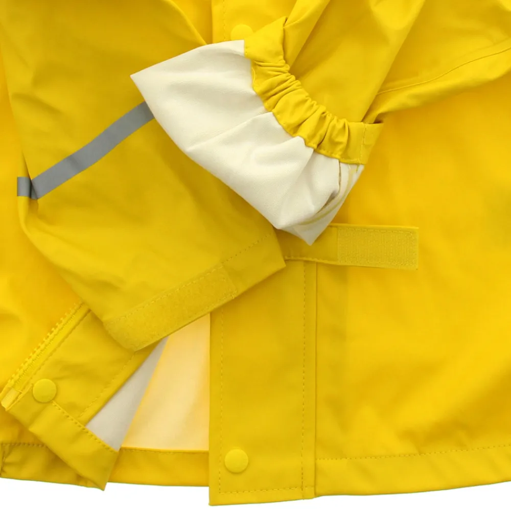 Regntøjet er i et slidstærkt materiale der klarer 5000 mm i vandsøjletryk, har tapede sømme og synlige reflekser.