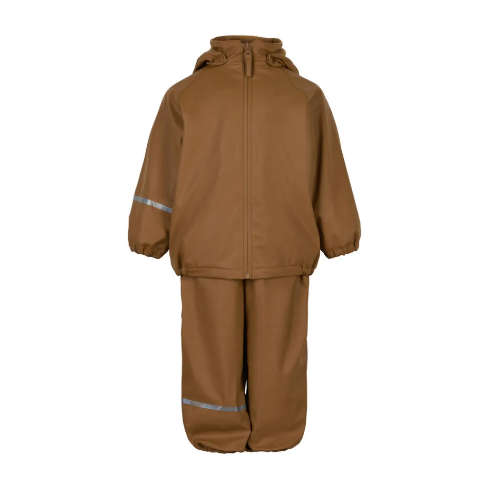 Praktisk foret regntøj med regnbukser og regnjakke fra CeLaVi lavet i recycled PU. Til og med str. 104 er regnbukserne lavet som smækbukser med seler med plastspænde fortil. De kan lukkes i siden med trykknap. Fra str. 110 og op er de lavet som taljebukser med elastik i taljen. Begge udgaver har refleksdetalje ved benet og praktiske støvlestropper. Regnjakken har aftagelig hætte, lukkes med lynlås med vindstolpe, der har trykknapper foran og har elastik ved ærmerne. Refleksdetalje på det ene ærme. Regntøjet har et vandsøjletryk på 10.000 mm. og er helt vandtæt.