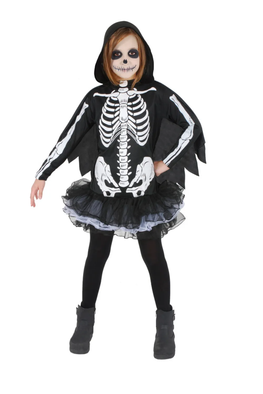 Bliv et klassisk sort og hvidt skelet, kostume indeholder kjole med skørter og kappe med hætte