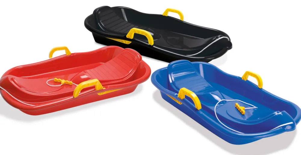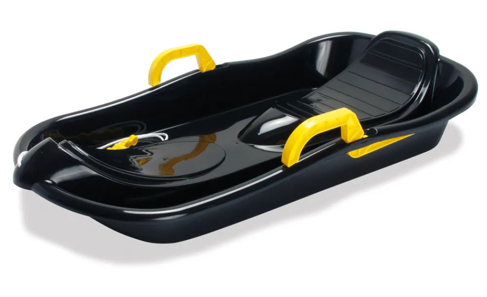 Bobslæde med bremser, i stærkt materiale, holder til bump og fart på vej ned ad kælkebakken. Nem at trække op ad bakken med snoren og håndtaget, som er monteret på kælken.