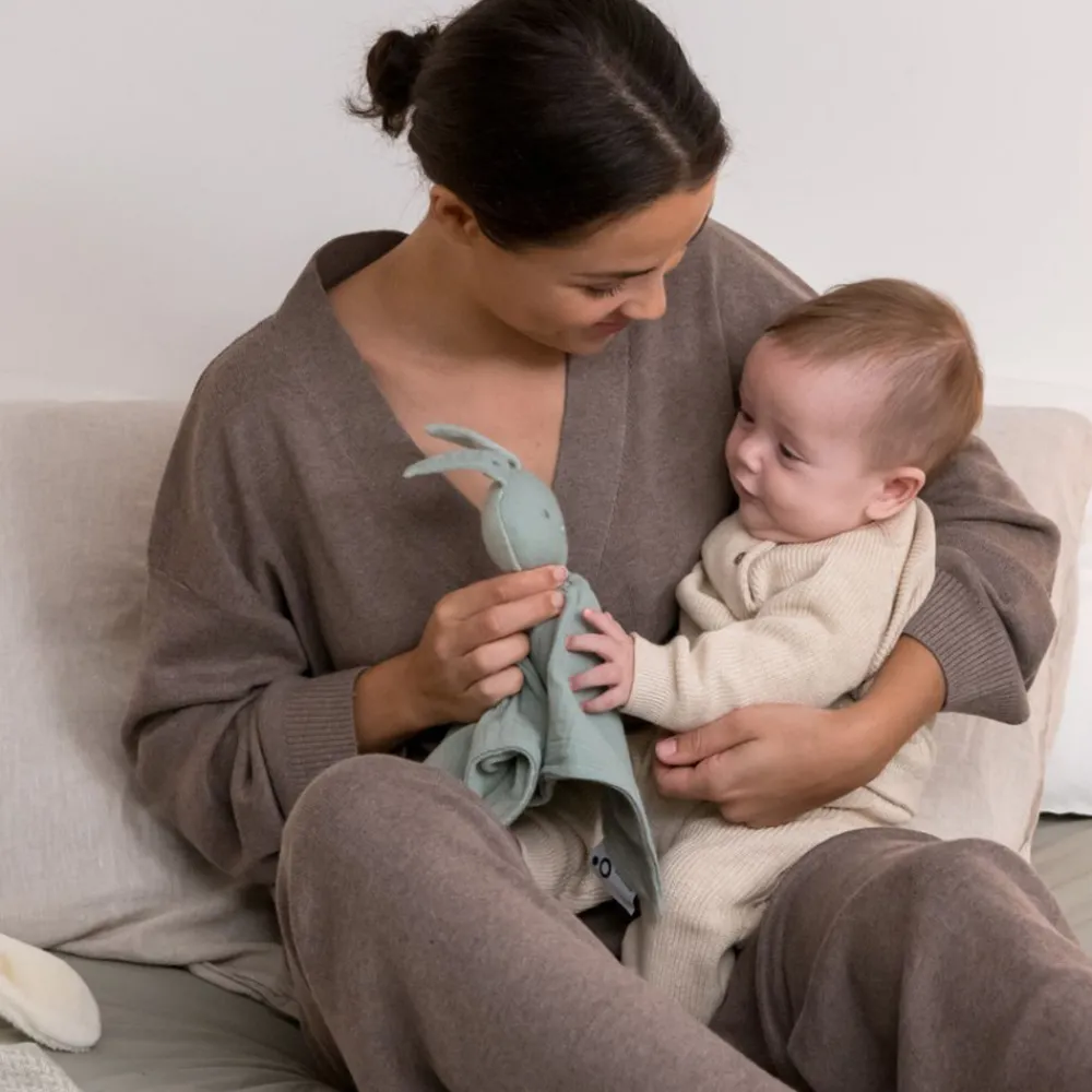 Doomoo nusseklud består af et vendbart lille dyr, hvor den ene side er en vågen kanin og den anden en sovende bjørn. Doomoo Blødt legetøj med to kæletæpper har en multifunktionel og smart funktion. Det giver tryghed gennem sansemotoriske egenskaber ved at bruge forældrenes duft i et af tæpperne.
