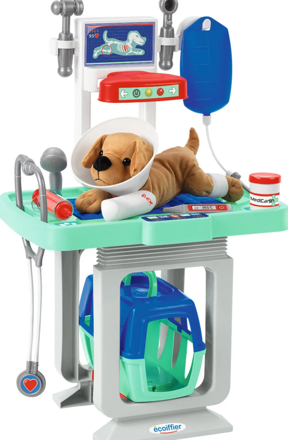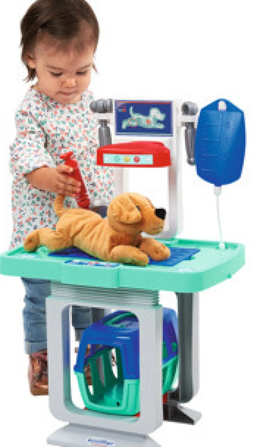 Nu kan dit barn prøve kræfter med, hvordan det er at tage sig af syge dyr. Dette veterinærcenter er udstyret med et operationsbord, hvor patienterne kan modtages og blive vasket, scannet og undersøgt. Derudover indeholder centret også en transportkasse samt en hund i plys.