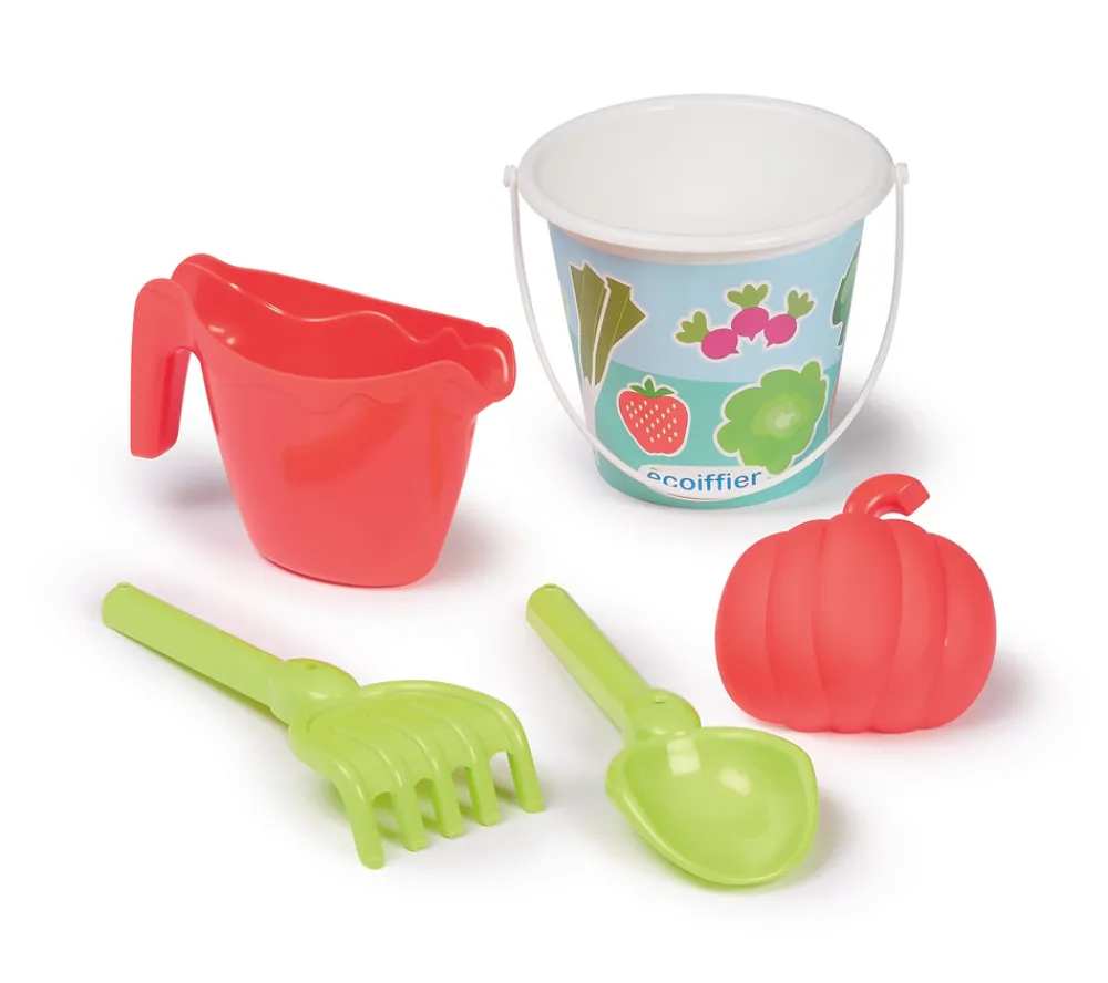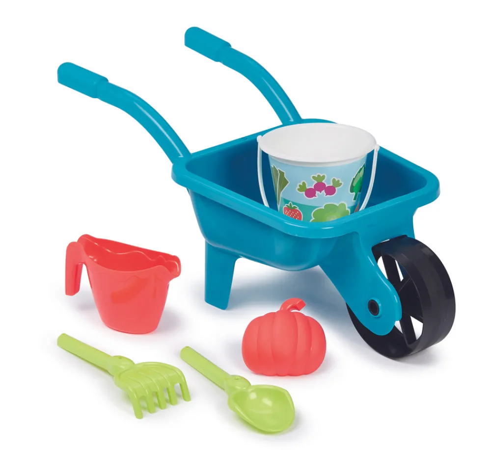 Trillebør med forskelligt tilbehør som kan anvendes i haven eller i sandkassen.