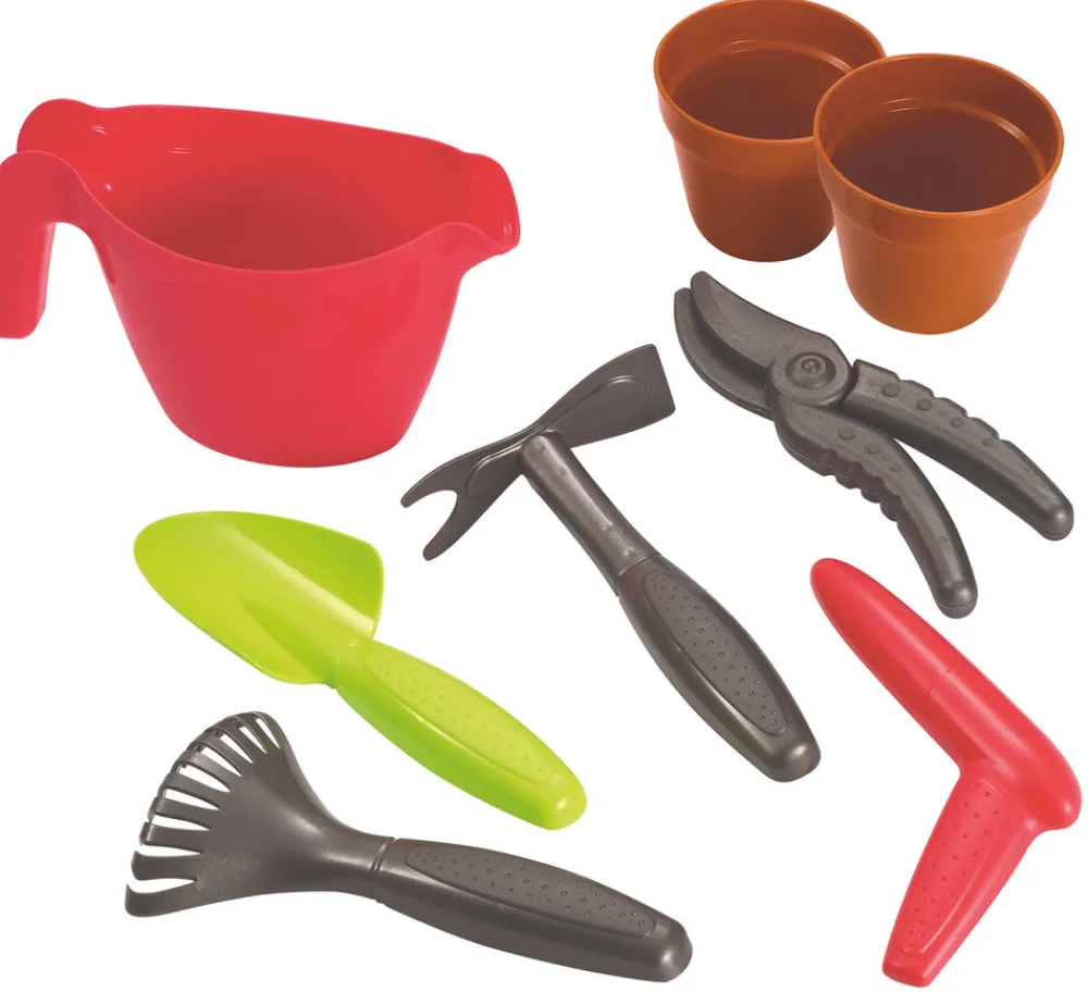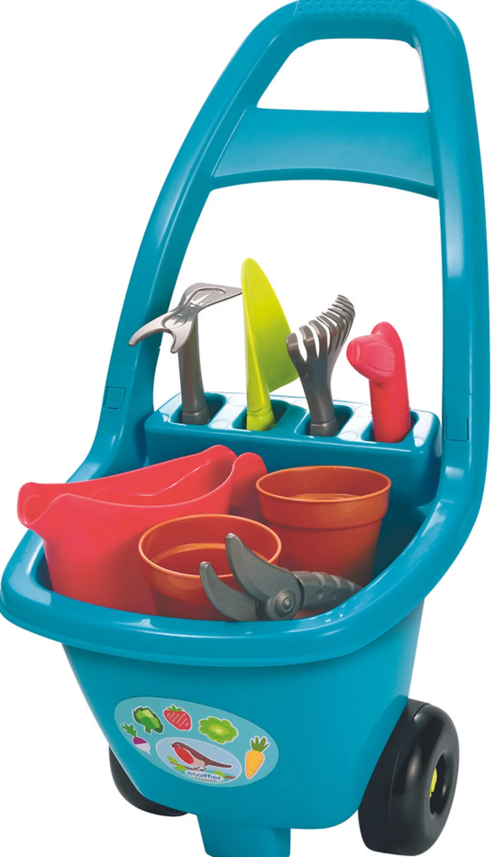 Havetrolley med forskelligt tilbehør, så de små poder kan prøve kræfter med forskellige opgaver i haven.