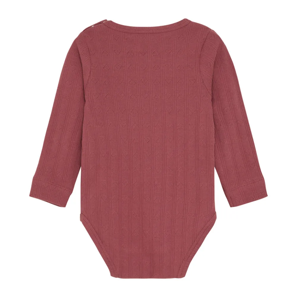 Sød body i pointelle med et elegant ternet mønster. Denne body er fremstillet i en blød og behagelig bomuldskvalitet, der føles skånsom mod den sarte hud. Den har lange ærmer og lukkes praktisk med trykknapper mellem benene, hvilket gør den nem at tage af og på. Et stilfuldt og komfortabelt valg til de mindste.