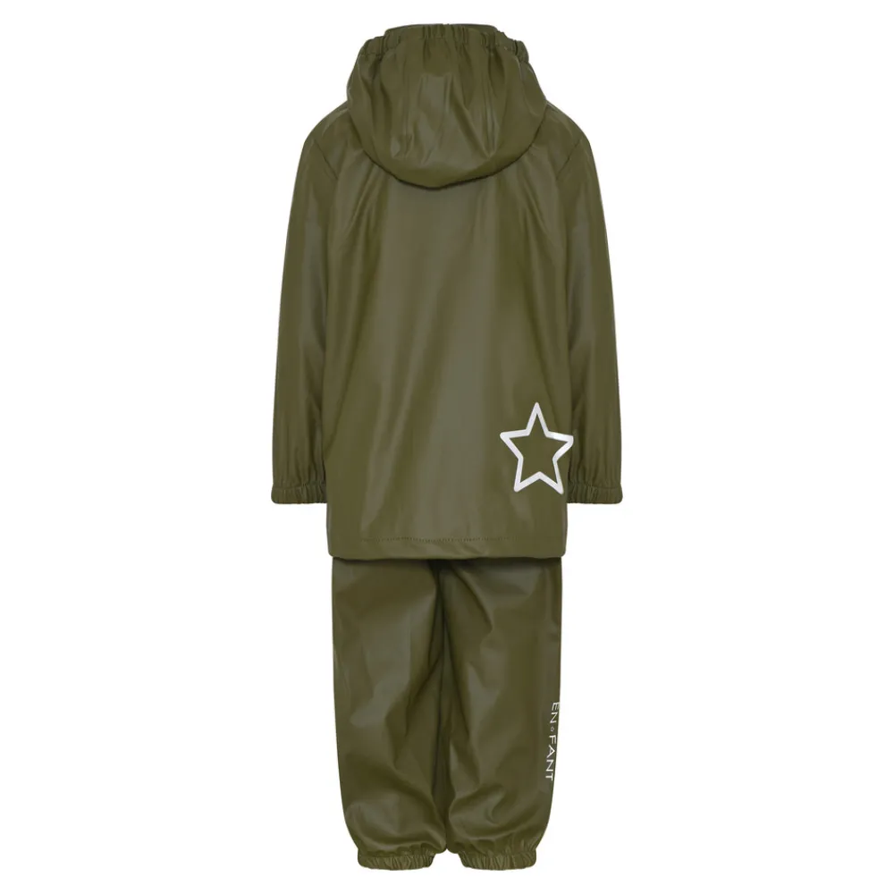 Regntøj i vind- og vandtæt funktionsmateriale fra EN FANT. Sættet har svejsede sømme. Jakken har aftagelig hætte med trykknapper og i øvrigt YKK lynlås i front. Elastisk, justerbar talje samt elastik ved ærmer. Bukserne har elastik forneden på benene og forstærket justerbar elastik under foden. Str. 86-104 har elastiske, justerbare seler med spænder i plast. Str. 110-140 er uden seler og har elastik omkring taljen. 3M reflekterende detaljer. Uden for. PU gummibelagt materiale uden miljøfarlige fluorcarboner. Vandfast: 5.000 mm.