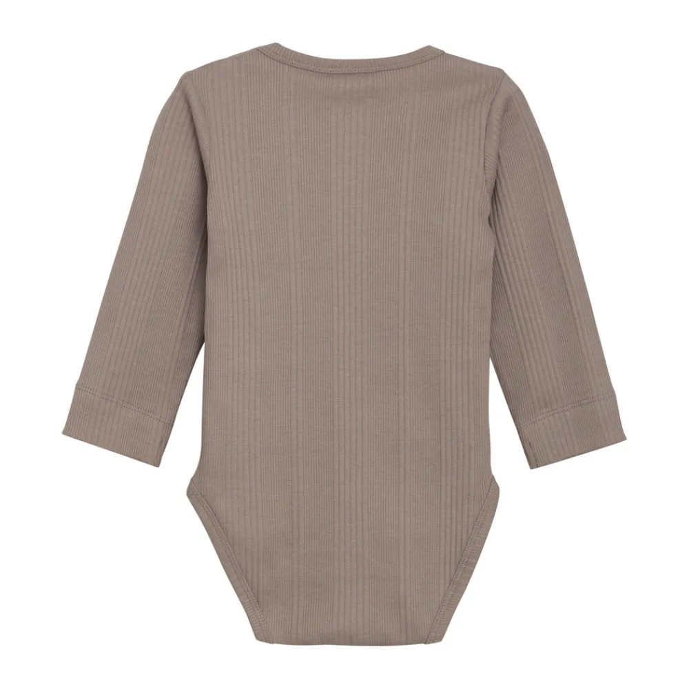 Klassisk body fra EN FANT i rib og ensfarvet design. Bodyen er fremstillet i en blød bomuldskvalitet, der føles behagelig mod huden og giver god komfort hele dagen. Den har lange ærmer, en rund halsudskæring og lukkes praktisk med trykknapper mellem benene – ideel til både hverdag og leg.