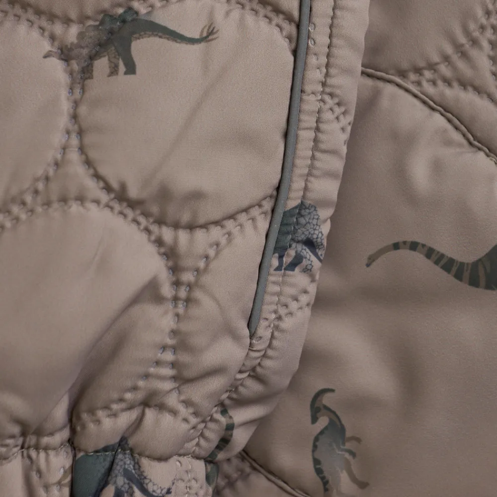 Dette termosæt består af en termojakke og matchende termobukser i samme farve og med et cool dinosaurmotiv, der gør det sjovt at klæde sig på. Jakken har refleksdetaljer bagpå, som øger synligheden i mørke og gråvejr.