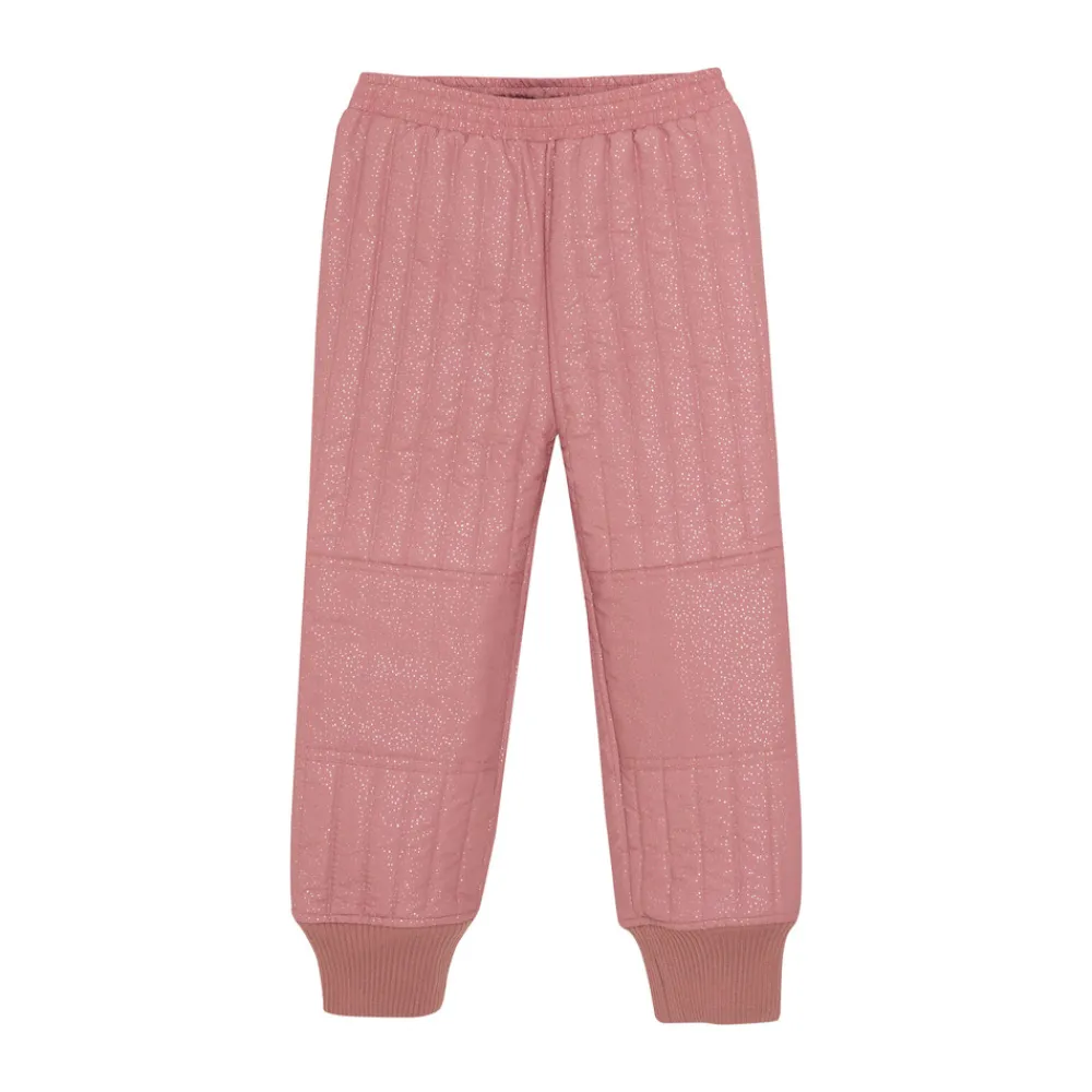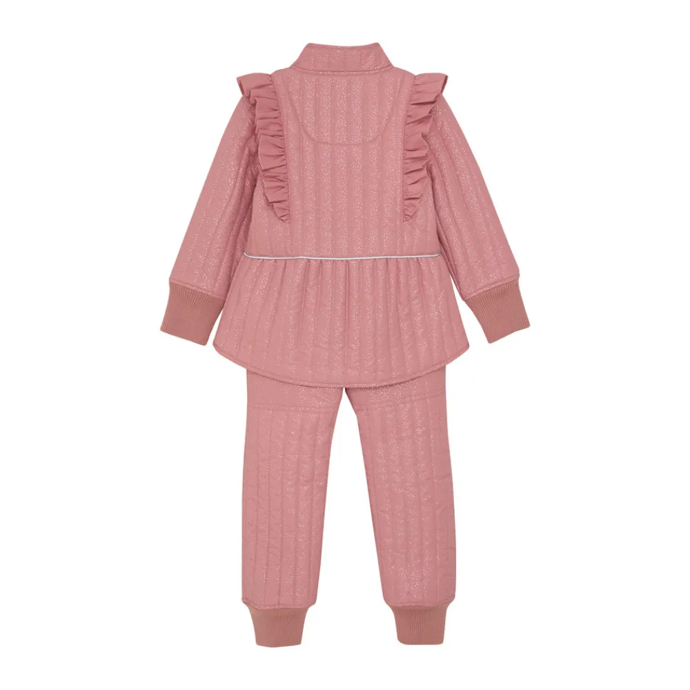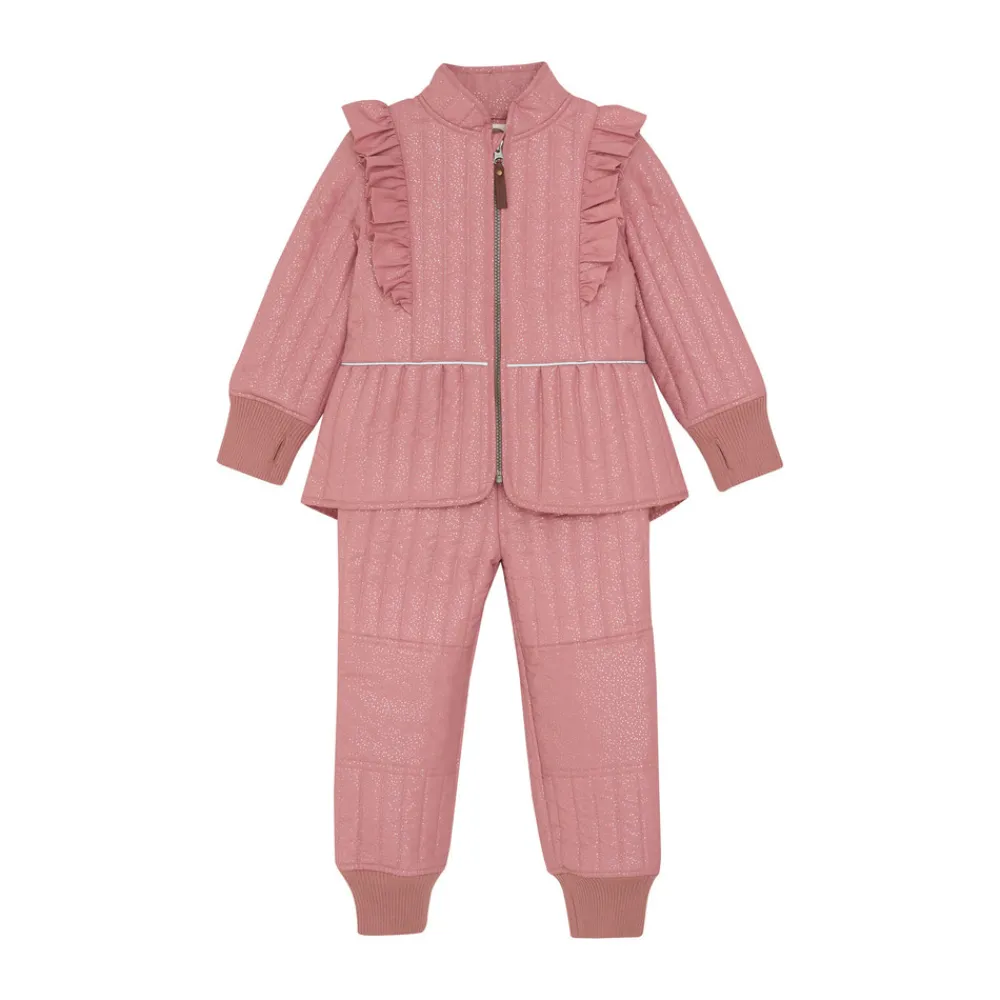 Termo sæt fra EN FANT med flot glitter design. Sættet består af en termojakke og termobukser i samme farve. Termojakken åbnes med kvalitetslynlås foran. Jakken har flæse på skuldrene og ned langs ærmernes på skæring foran og bagpå. Jakken har brede ribkanter i ærmerne med et praktisk hul til tommelfingeren. Jakken har lommer i siderne og refleksdetaljer bagpå. Jakken er lidt længere bagpå end foran. Termobukserne har elastikkant i taljen, som kan strammes sammen med en elastiksnøre på indersiden. Ved anklerne er der brede ribkanter.