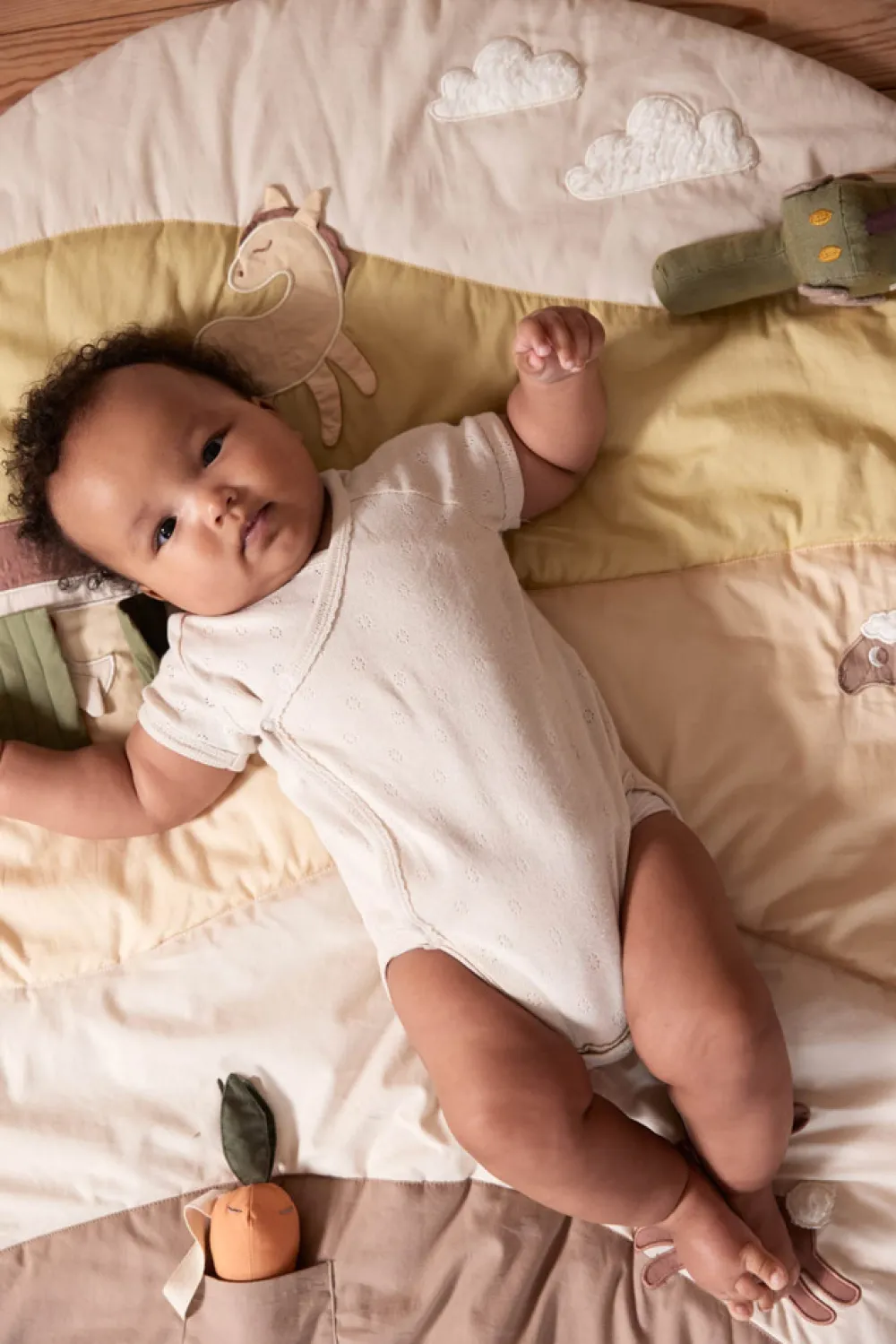 Aktivitetstæppet er lavet af blød økologisk bomuld og er let fyldt med genbrugspolyester, så din lille kan gå på opdagelse fra et blødt og sikkert sted. Aktivitetstæppet måler 90 centimeter i diameter og passer perfekt ovenpå FILIBABBA legemadrassen eller Loui Activity gym. Tæppet er godkendt fra 0+.