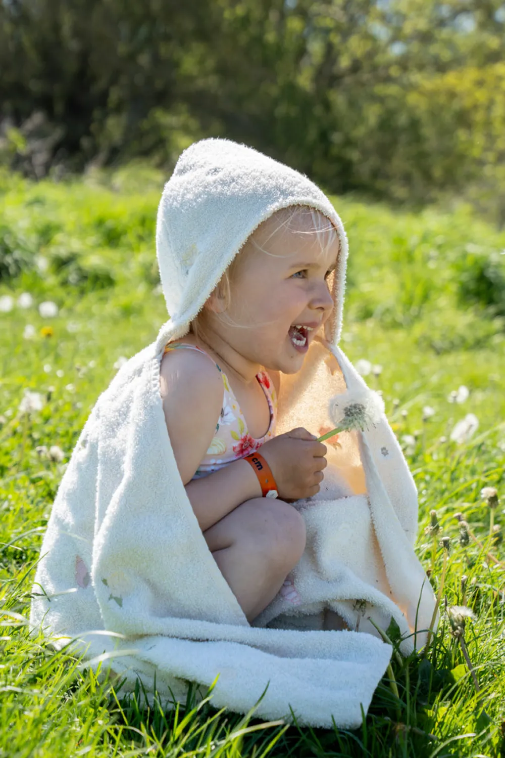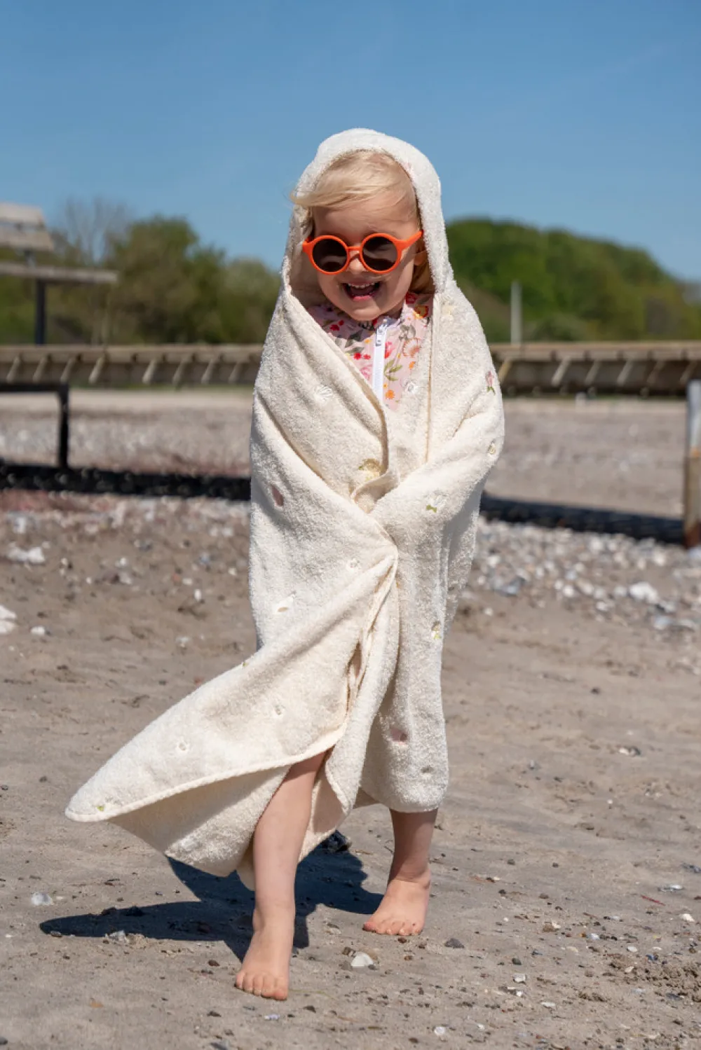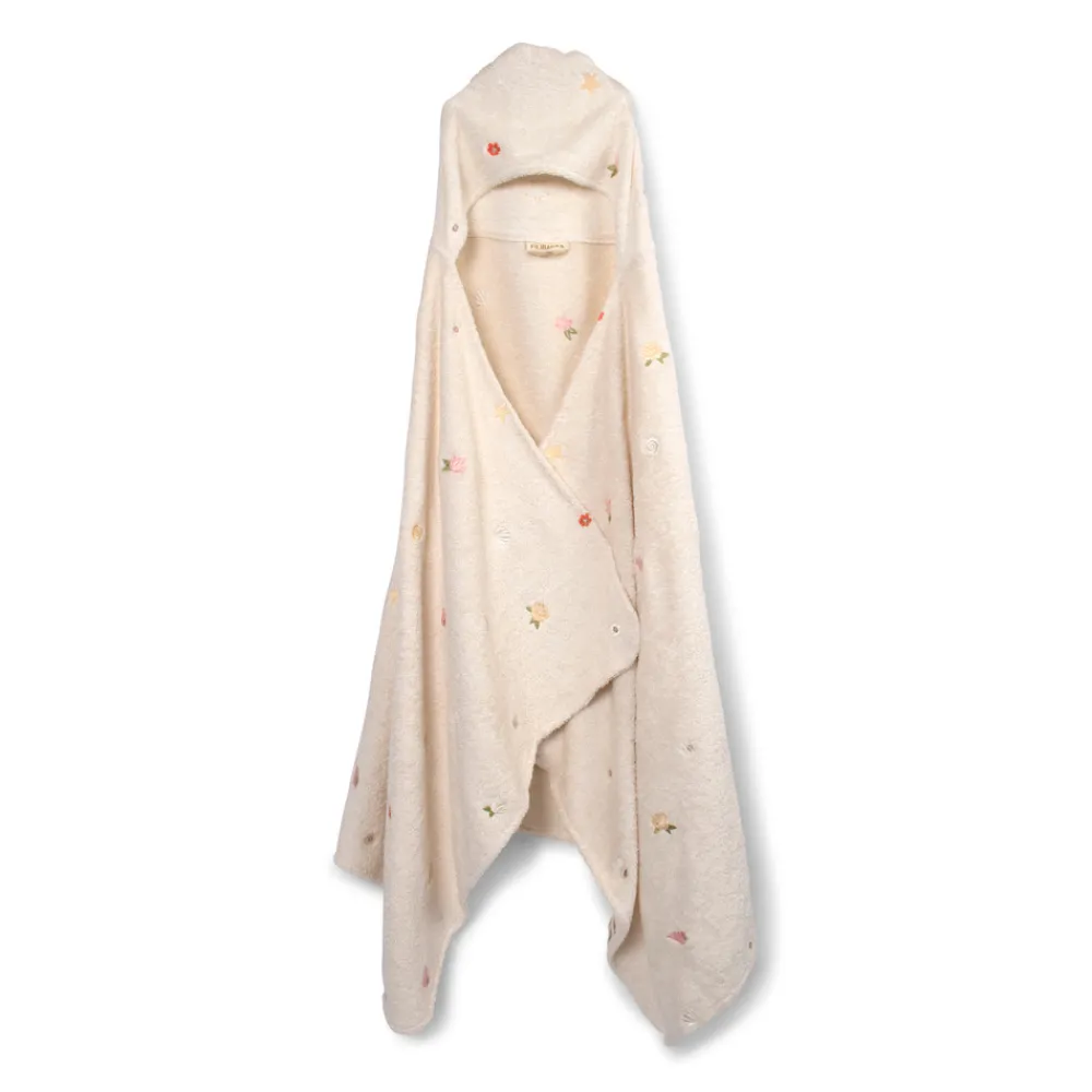 Når du har brug for en pause efter at have leget i vandet, er der intet bedre end at svøbe dig i det blødeste badehåndklæde og putte dig ind til dine forældre. Det store badehåndklæde med rummelig hætte er lavet af 100% økologisk bomuld i en utrolig blød kvalitet og med smukke broderede detaljer. Med smarte trykknapper i siderne sidder ponchoen også godt, når du leger. Det har aldrig været sjovere at komme op af vandet!