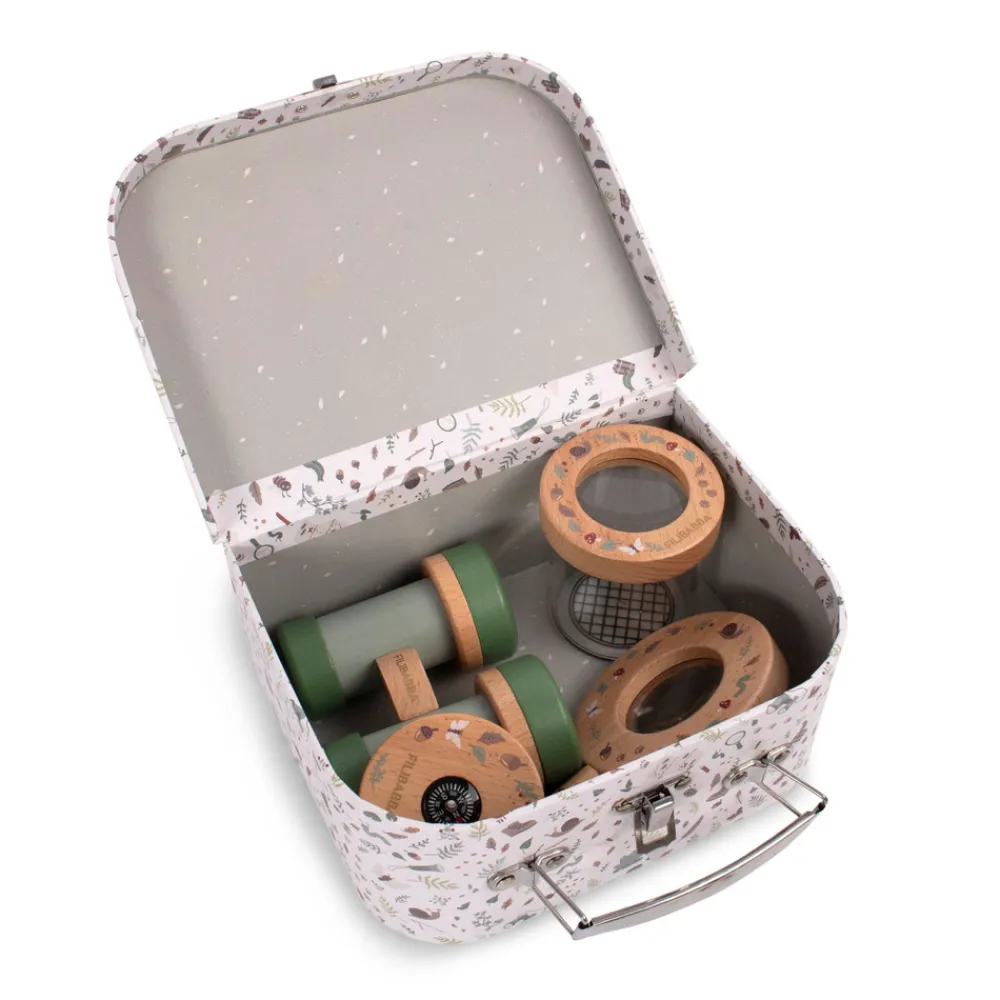 I kufferten finder du en kikkert, et insektglas med lup, et kompas og et forstørrelsesglas, som du kan gå på opdagelse med. Hvert legetøj i sættet har detaljer af træ, der gør legen ekstra sjovt.