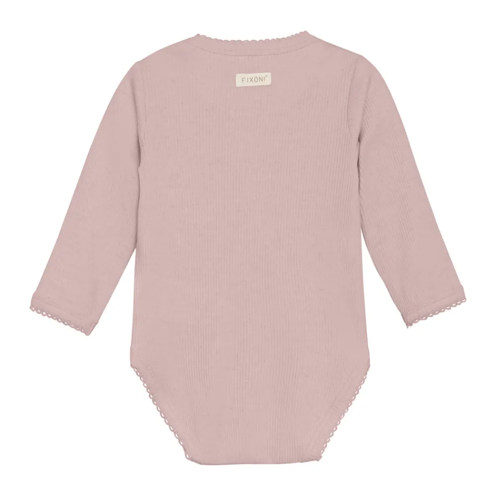 Langærmet slå-om-body fra FIXONI i ensfarvet mélange-kvalitet. Bodyen er fremstillet i en blød og behagelig kvalitet og lukkes nemt med trykknapper foran og mellem benene – praktisk ved både påklædning og bleskift.