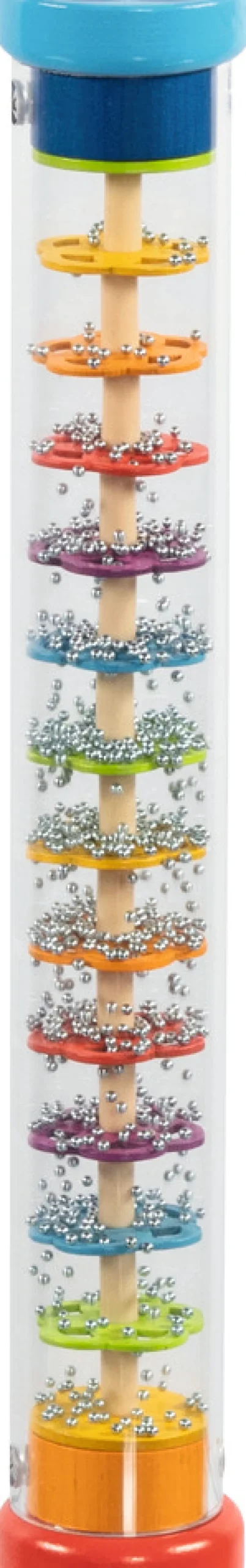 Regnstaven er fyldt med små kugler og farverige ringe. Nyd den beroligende lyd imens du ser kuglerne falde fra toppen til bunden.