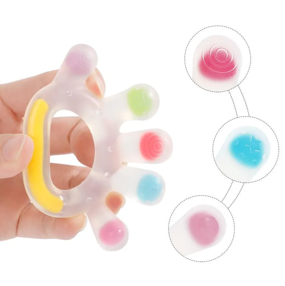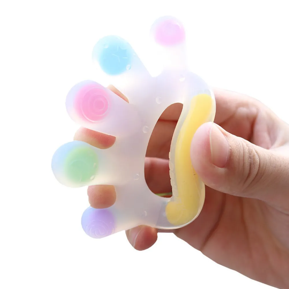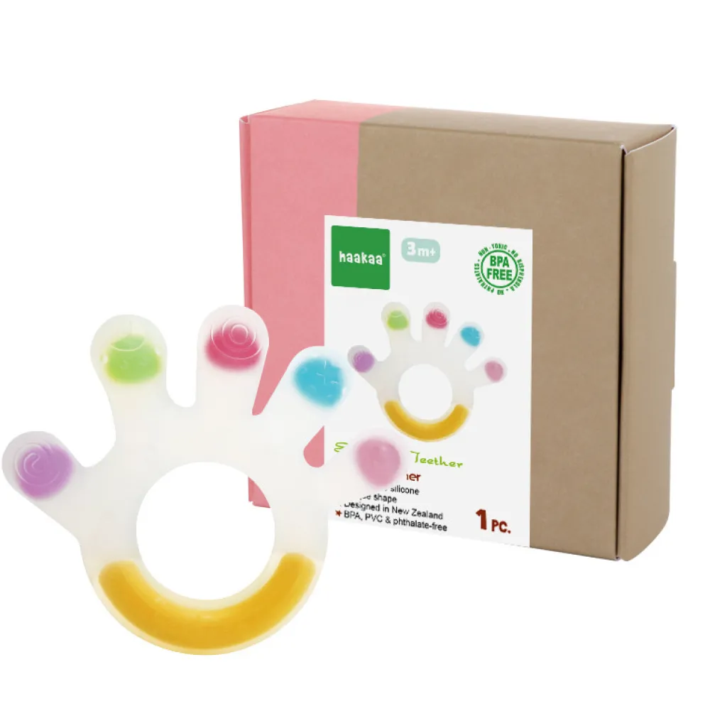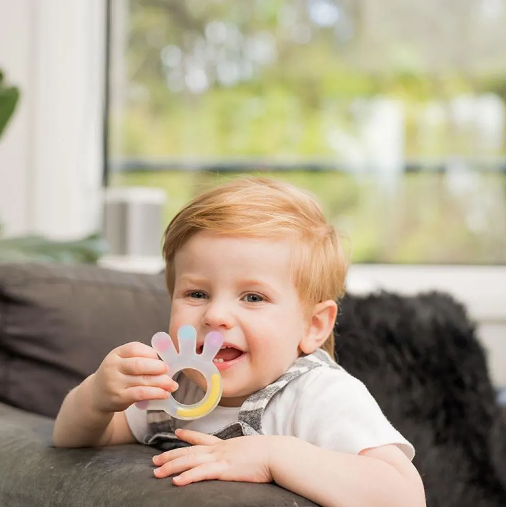 Bidelegetøj formet som en hånd. God til at styrke mundmotorikken. Kan kommes i køleskabet for lindre gummerne. Haakaa bideringen vil med de farverige farver fange barnets opmærksomhed. På hver finger er der en forskellig struktur, som stimullerer gummerne. Bideringen mindsker smerten og ubehaget, når de begynder at komme tænder.