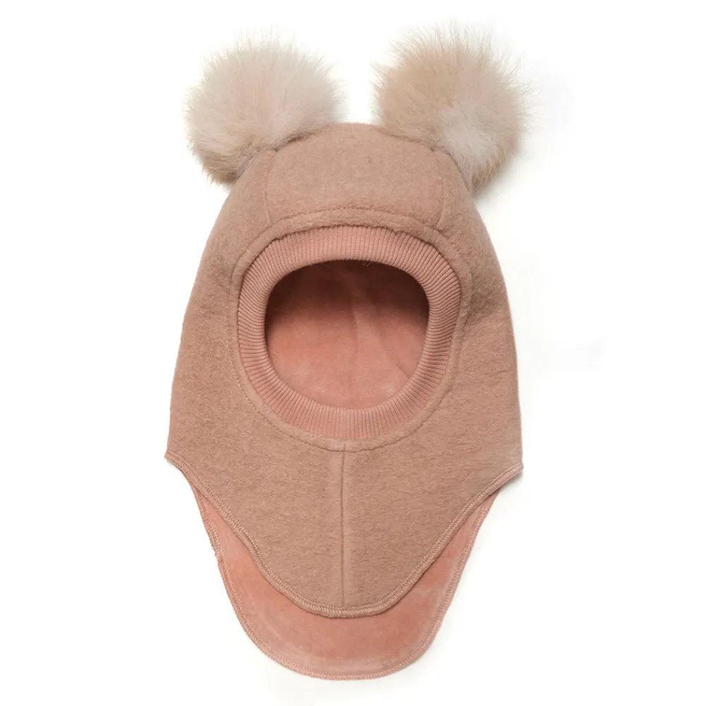 Sød Huttelihut elefanthue i meleret uldkvalitet med alpaca kvaste på toppen. Huttelihut elefanthuen har en rund hovedform og en elastisk ribkant omkring ansigtet, så huen er lukker godt til. Huen har en praktisk spliteffekt med ekstra længde i nakken. Huttelihut elefanthuen er i to lag med velour i indersiden.