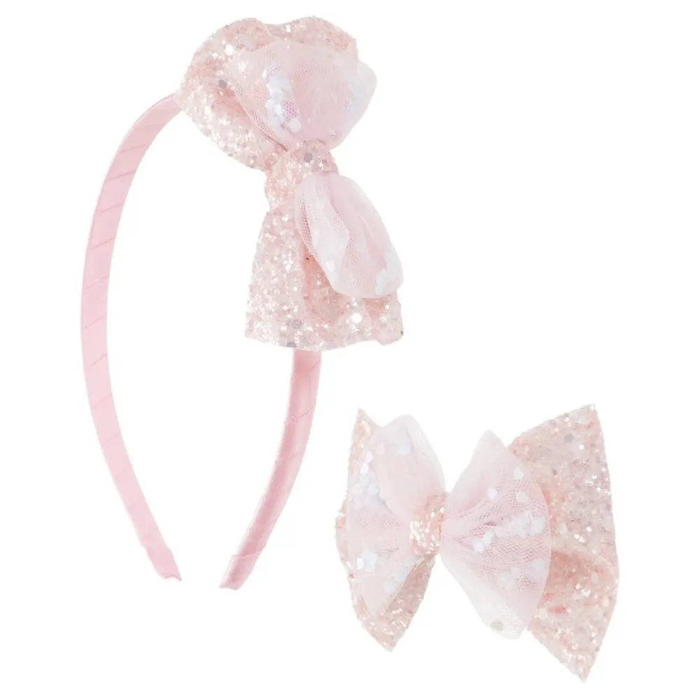 Hårpynts sæt med stor glitter hårbøjle og 3 miks spænder.