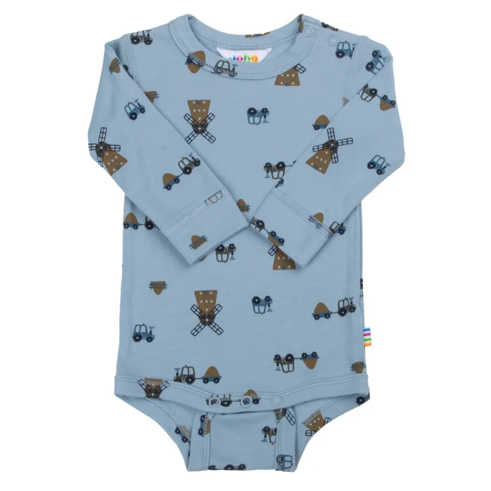 Trykknapper på den ene skulder og mellem benene. En lækker blød viskose kvalitet baseret på 100% økologisk bambus med en glat overflade, som er rigtig dejlig at have på. Sødt print.