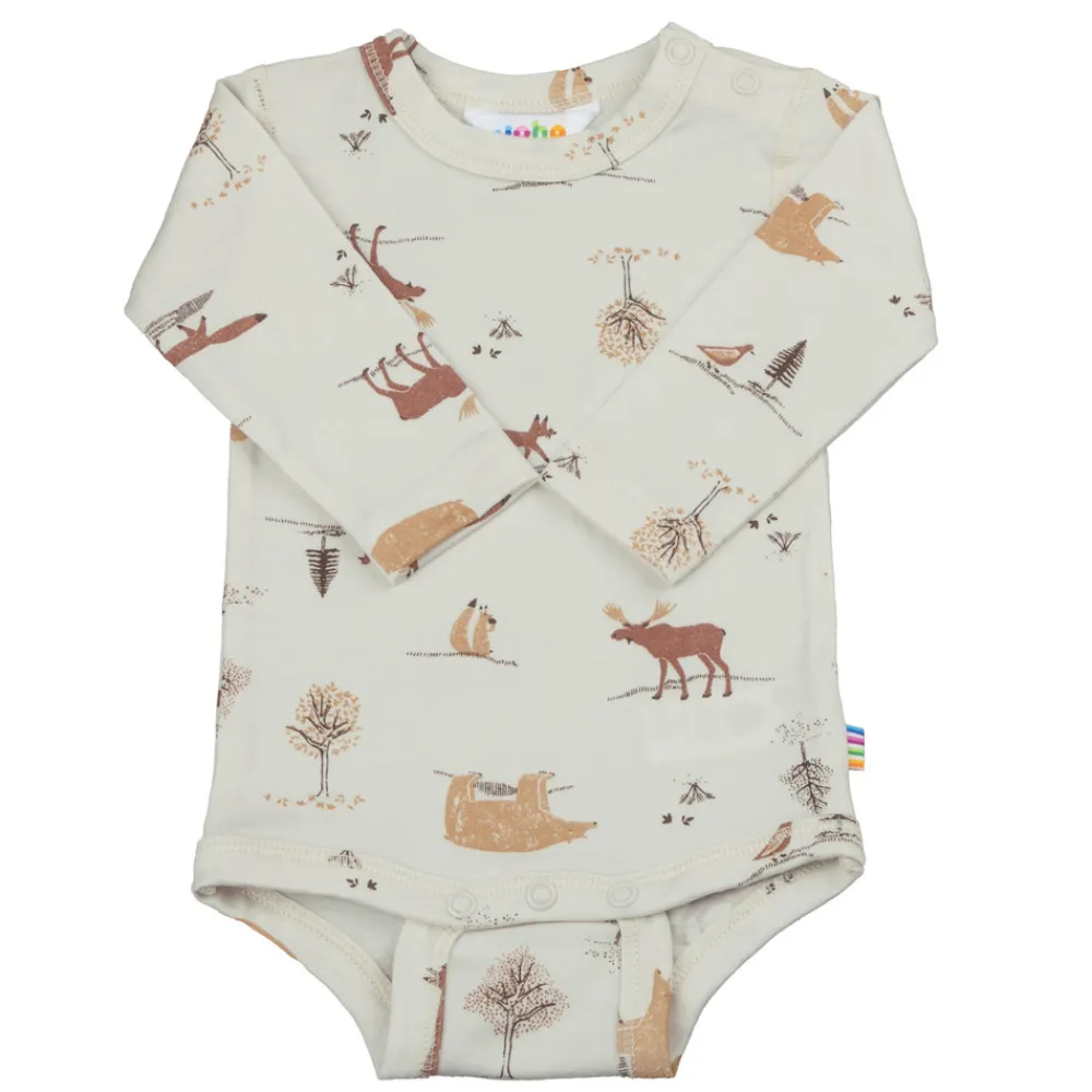 Body med lange ærmer. Trykknapper på den ene skulder og mellem benene for en nemmere påklædning. En ekstra fin og let uldkvalitet som er meget behagelig at have på. Sødt print.