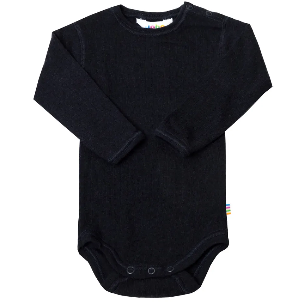 Body med lange ærmer. Trykknapper på den ene skulder og mellem benene. Virkelig en blød, elastisk let uldkvalitet med lodret rille mønster. Kvalitetens strækevne gør at den er behagelig at bruge inderst. Ensfarvet. Pure merino wool og Nordic Ecolabel mærket.