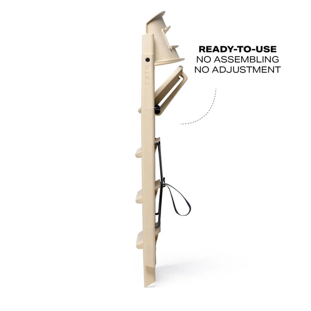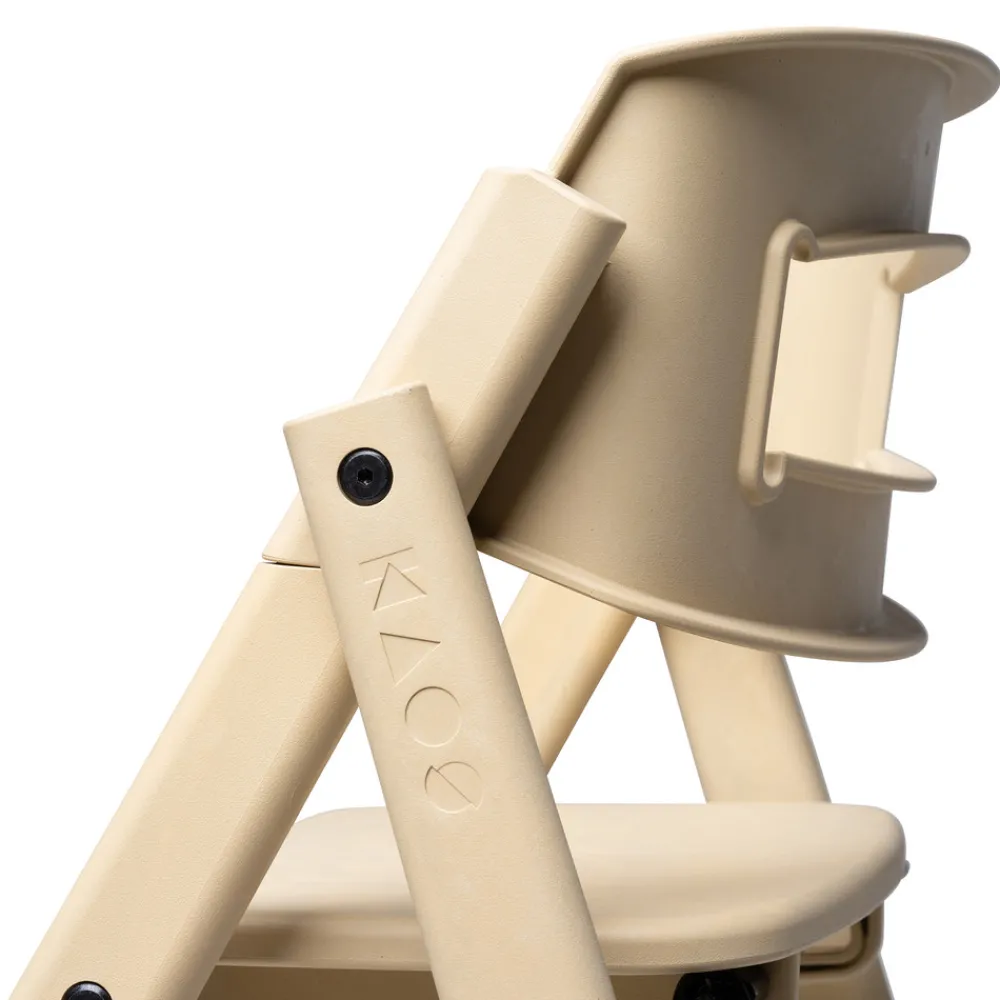 KAOS Klapp højstol kommer færdig samlet i æsken og kræver ingen montering. Fold benene ud og skub sædet ned, indtil du hører et “klik”, og sædet er i låst position.