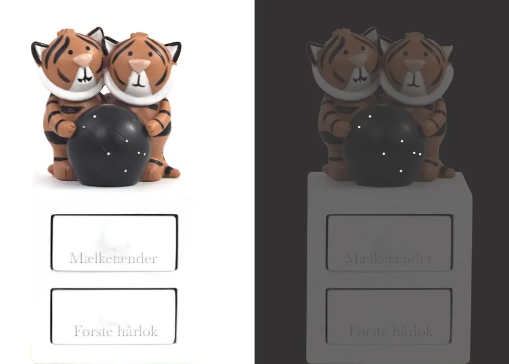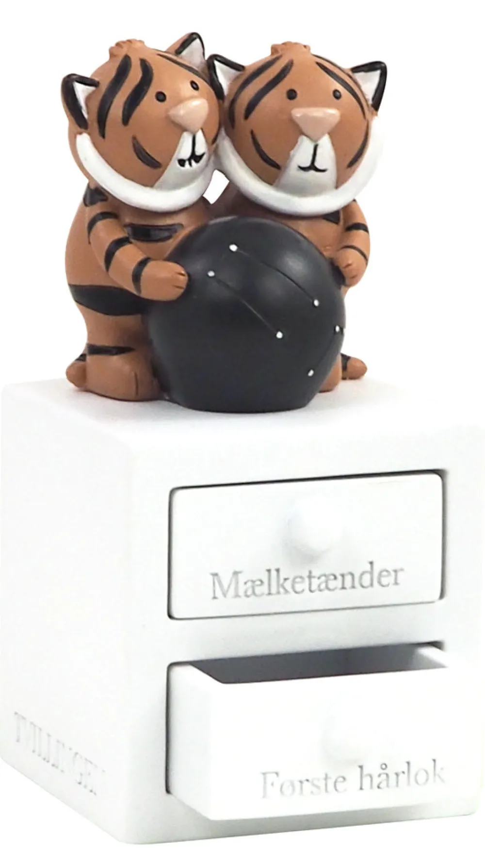 , som lyser i mørket. Figuren har to skuffer – En til første tand og en til hårlok. Super fin dåbsgave ide. Æsken er håndmalet så der kan være variationer.