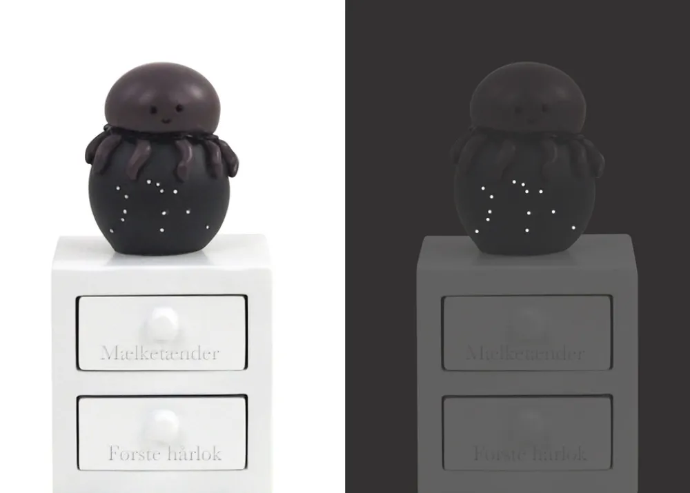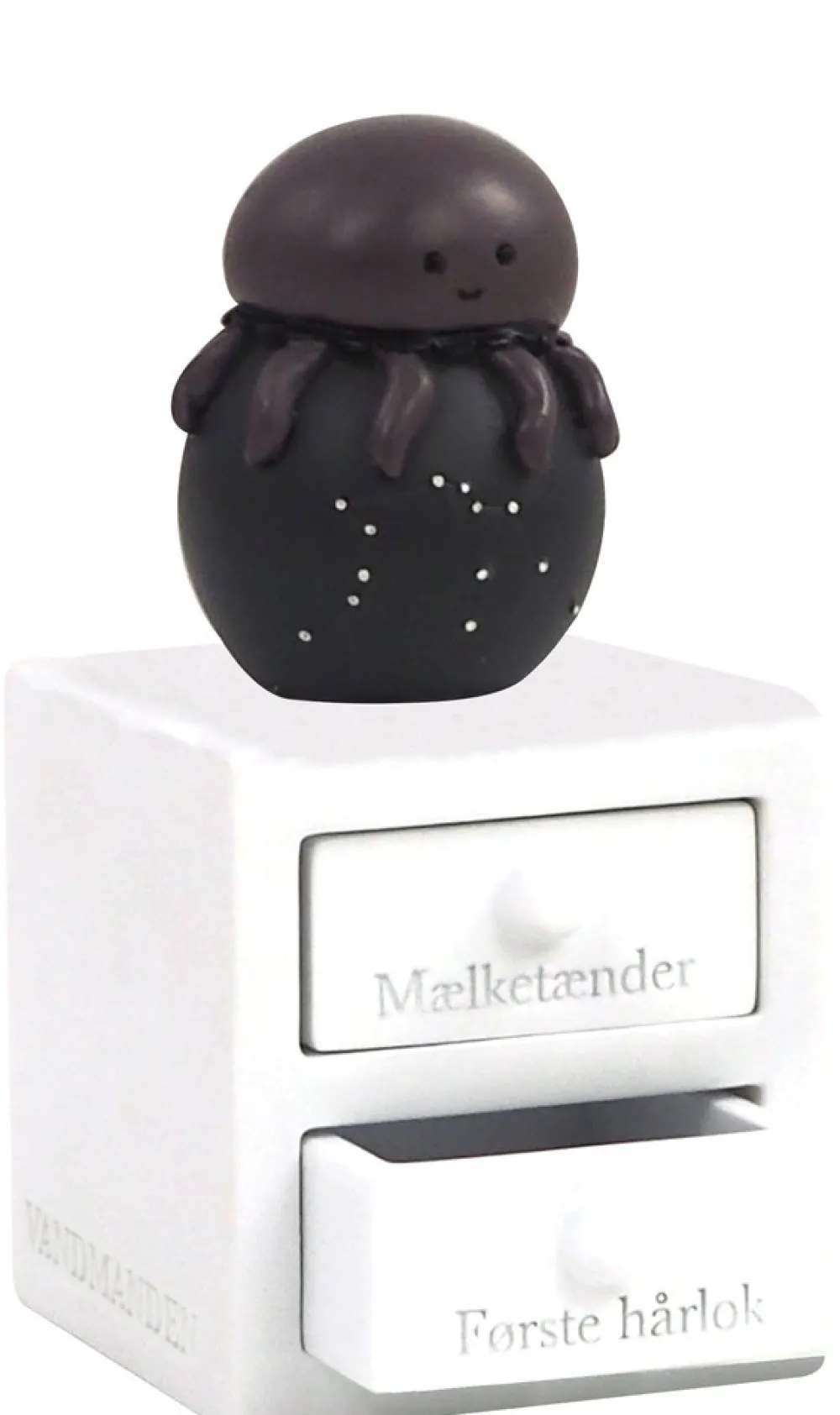 Første tand og hårlok æske med vandmanden stjernetegn, med planet og stjernebillede, som lyser i mørket. Figuren har to skuffer – En til første tand og en til hårlok. Super fin dåbsgave ide. Æsken er håndmalet så der kan være variationer.