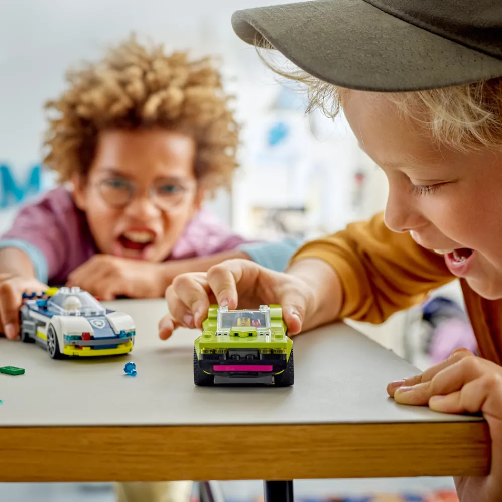 Der har været en fangeflugt! Hop ind i førerhuset på den seje politi-interceptor, og kør på jagt efter en af LEGO® Citys mest eftersøgte skurke. Denne maskine er udstyret med en stor hækspoiler, cool fælge og lavprofildæk, der giver ekstra fart og vejgreb. Kør hvinende rundt i sving, og lav seje drifts for at indhente skurken i hendes hurtige muskelbil 60415! Der venter fantastisk action forude i LEGO City!