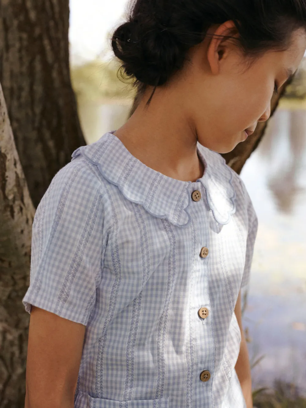 Giv din piges garderobe et friskt pust med denne charmerende ternede skjorte med sød flæsekrave. Skjorten er perfekt til både hverdag og særlige lejligheder, og den kombinerer klassisk ternet mønster med en moderne flæsekrave for et unikt look.