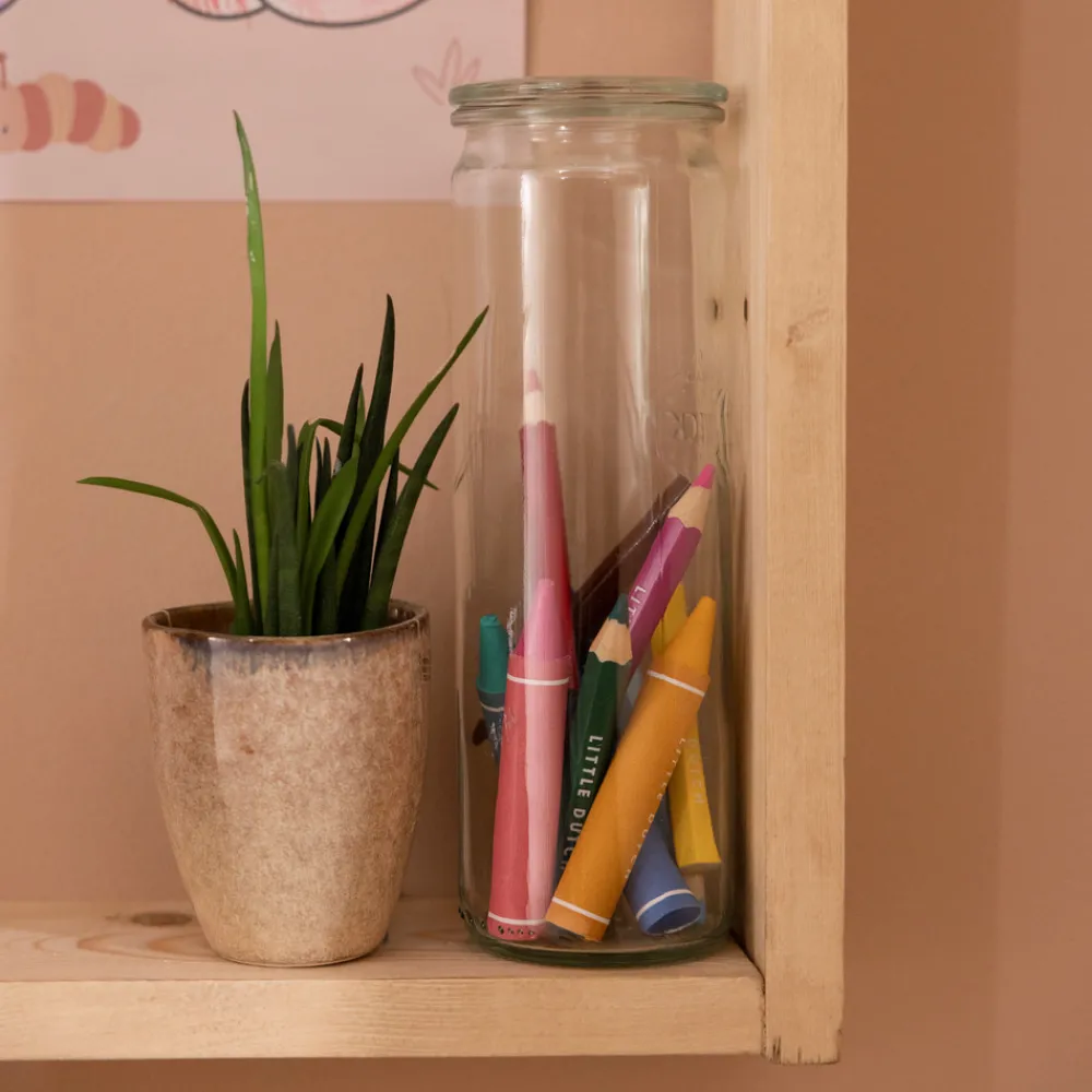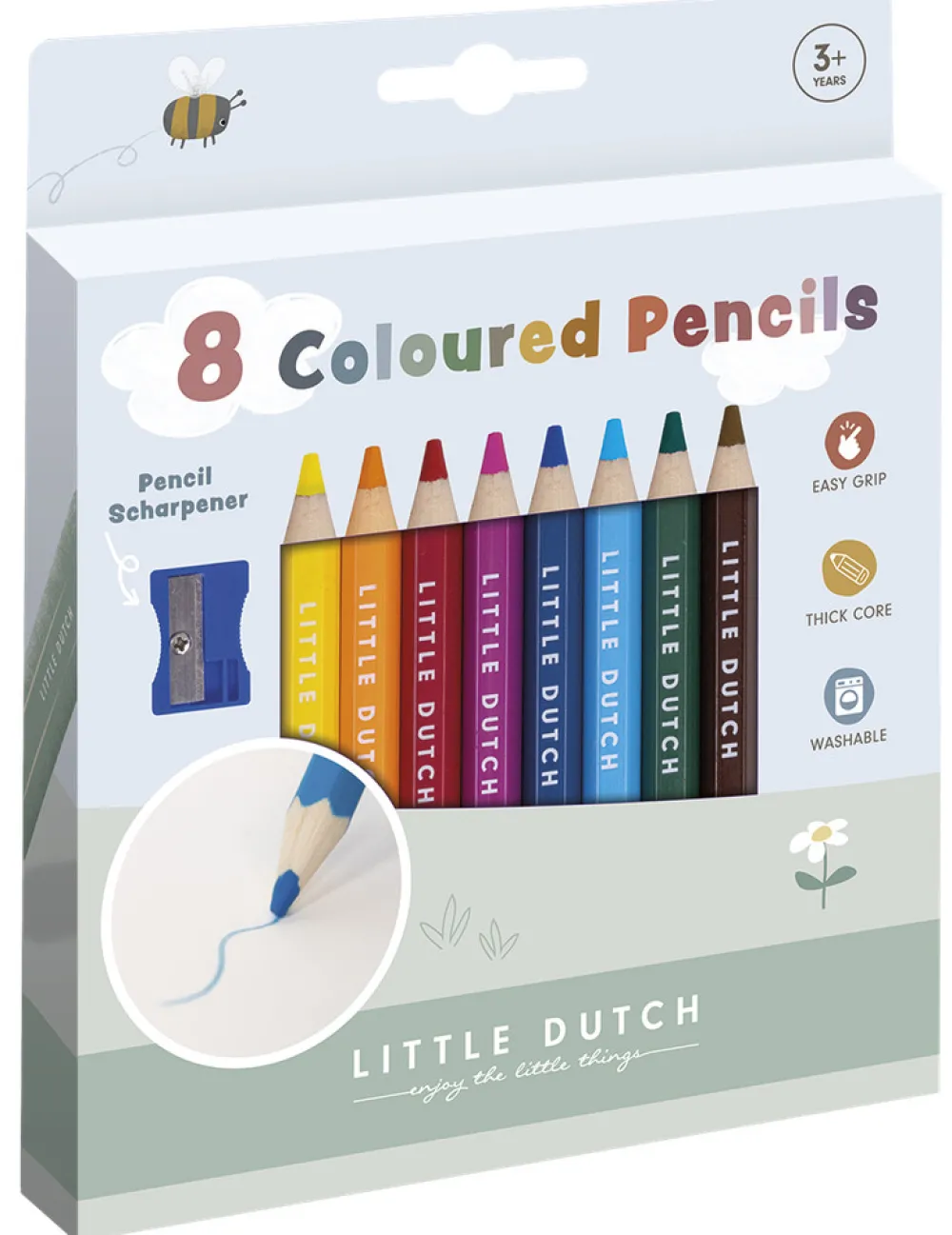 De søde farveblyanter kommer i 8 muntre farver og med en matchende blyantspidser. Blyanterne er nemme at få fat i og kontrollere, hvilket gør dem ideel for en lille kunstner.