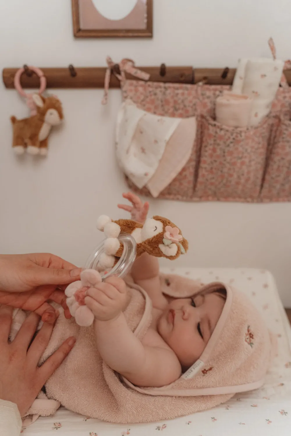 Grib, drej og ryst! Den søde hjort med sin bløde pels opfordre til at leg. Den gennemsigtige ring indeholder 3 farverige små perler, som begynder at rasle, når den rystes. Ringranglen sætter gang i nysgerrighed og sanser, samt styrker hånd-øje-koordinationen.