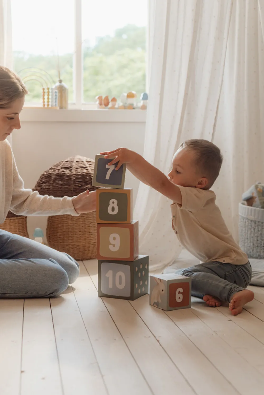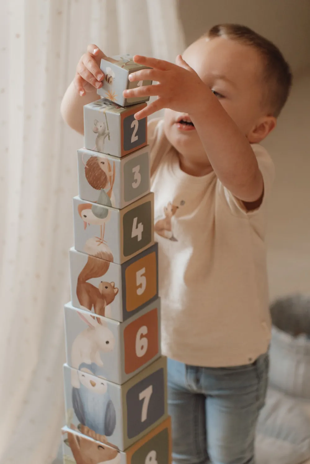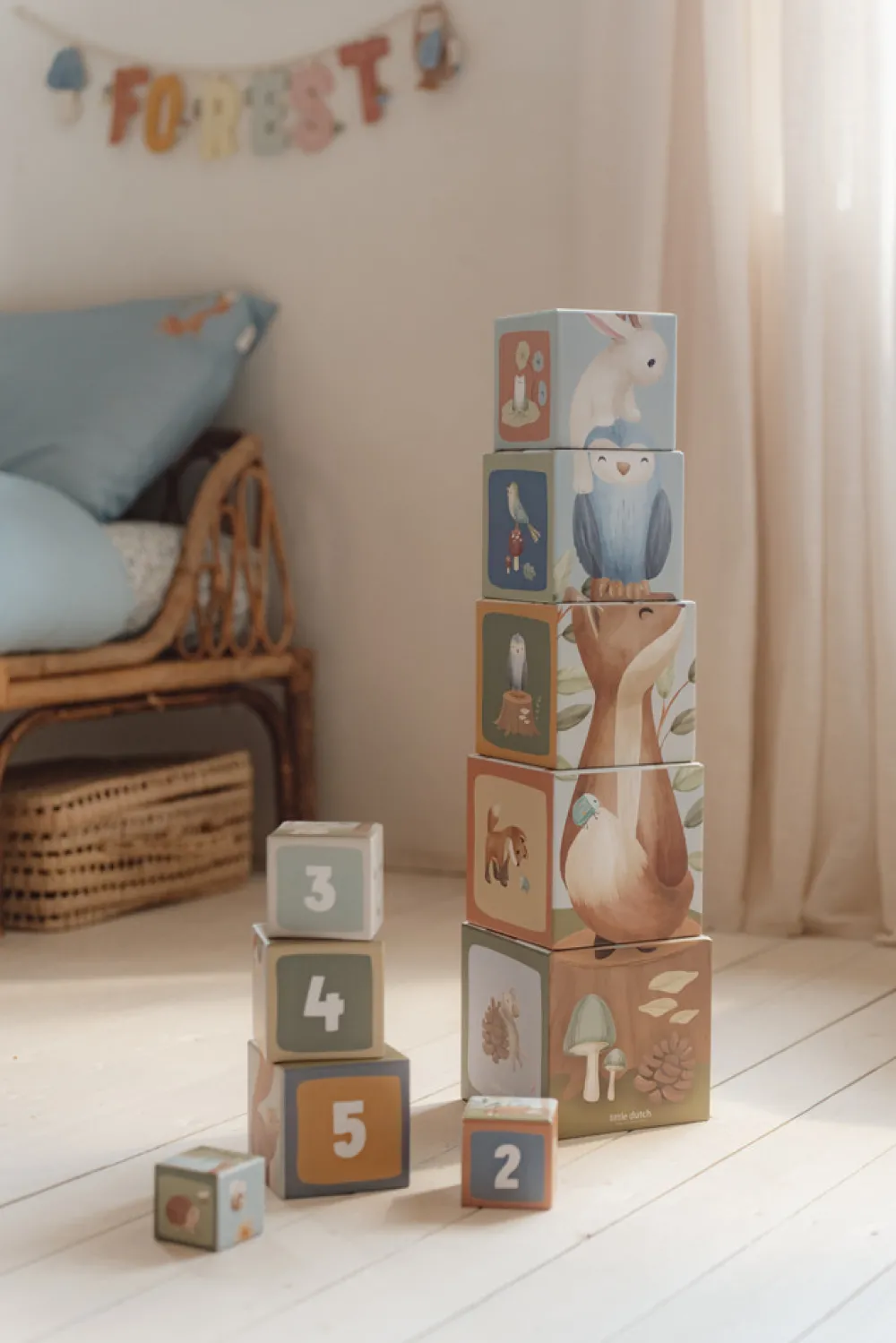 Med disse Stabelkasser kan børn på en legende måde lære at tælle til 10. Hver klods har dejlige illustrationer fra Forest Friends-kollektionen, bl.a. ræv, egern, kanin, pindsvin, ugle og en svamp. De kan stables til et højt tårn eller stilles op på en lang række. De små kasser kan placeres inde i de større, så de er nemme at rydde op. Kasserne er lavet af robust pap, så de er meget holdbare. Den mindste kasse måler 5 cm, og den største er 14 cm.