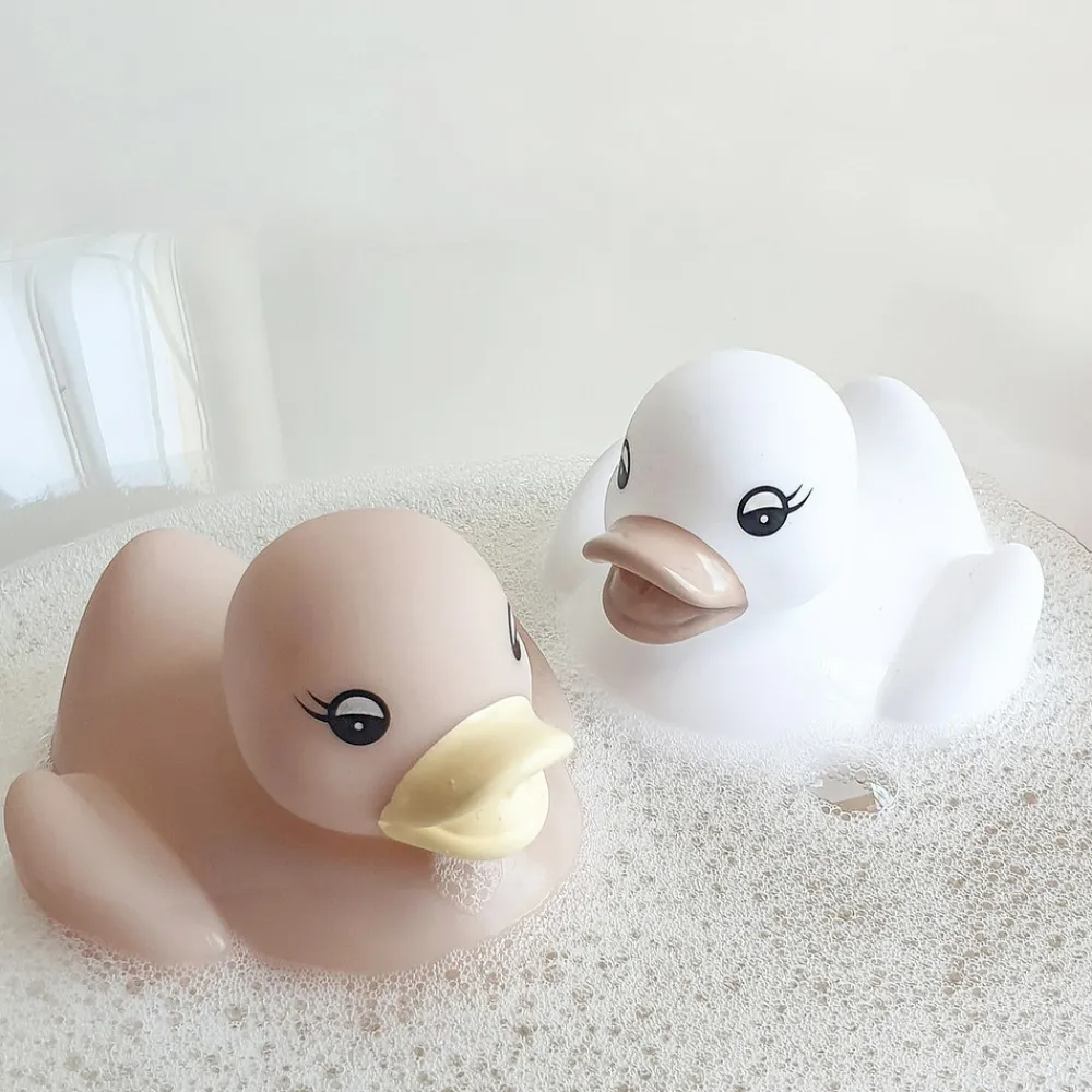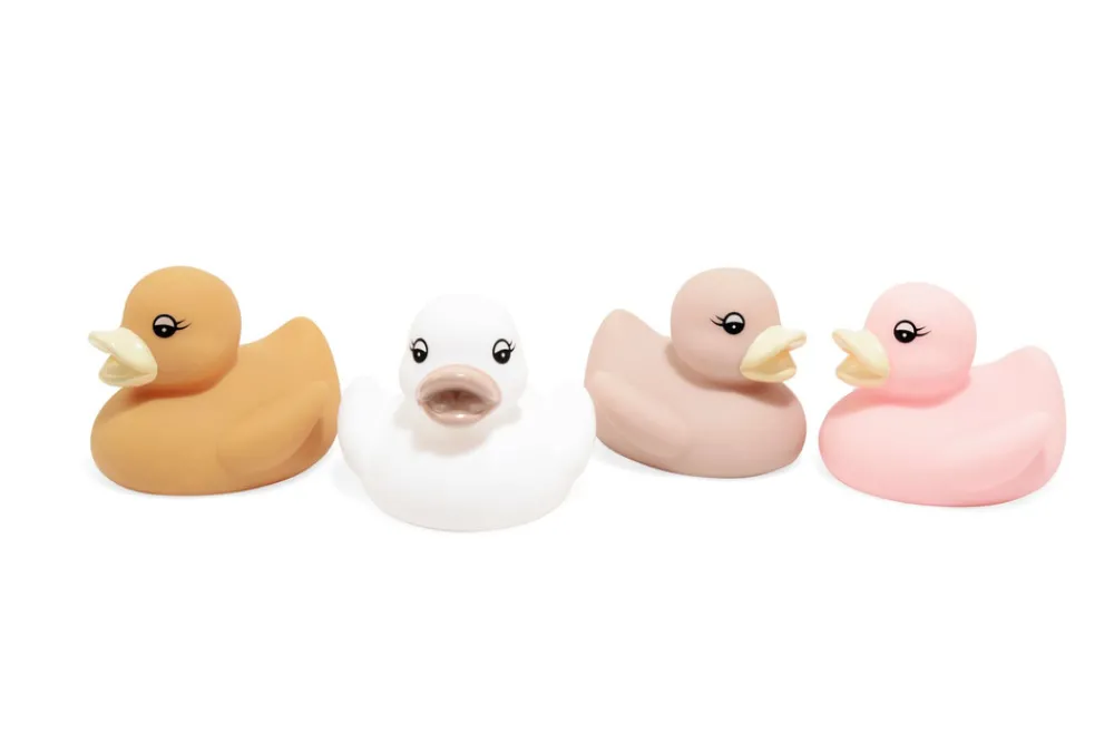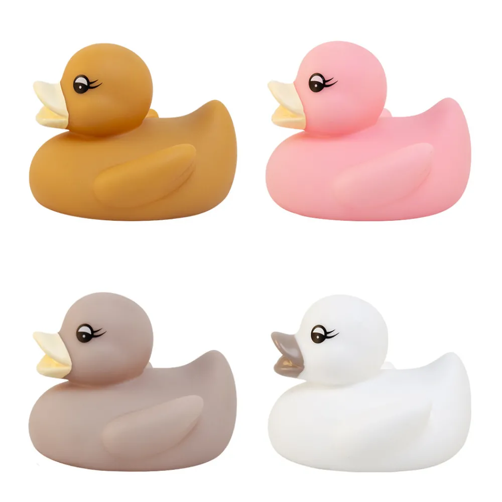 Dette sæt indeholder 4 charmerende badeænder i forskellige farver, præsenteret i en fin æske.