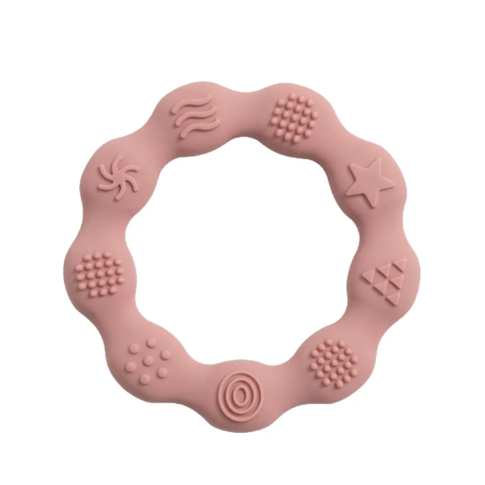 Silikone bidering med forskellige taktile overflader. God til barnets kløende gummer og nem at holde ved for barnet selv.