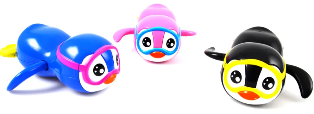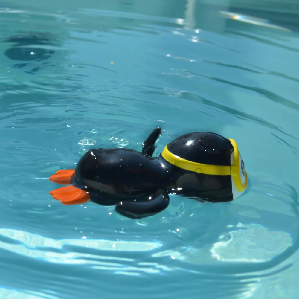 Badelegetøj med træk-op funktion, formet som en lille sød pingvin.