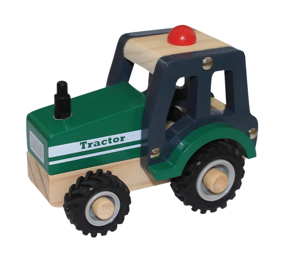 Traktor i træ med gummihjul.