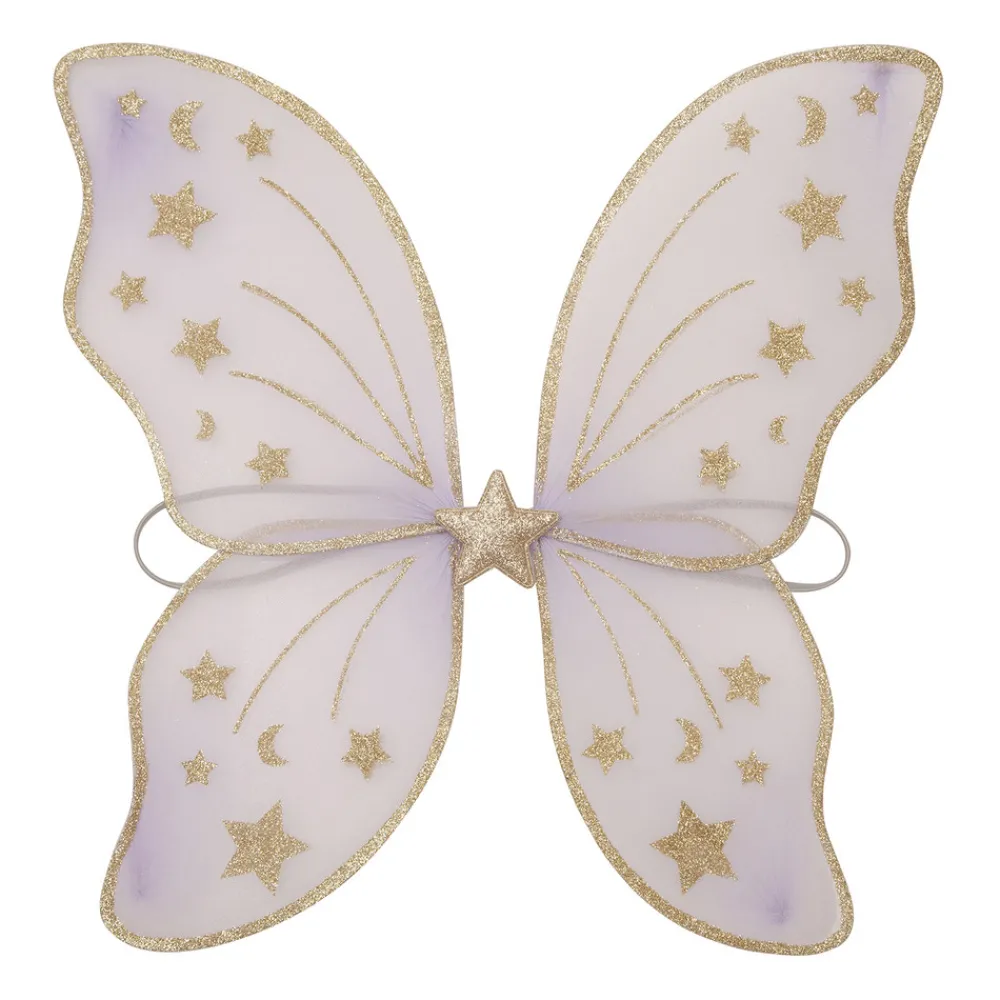 Fe-vinger med dekoration af guldmåner og -stjerner med en stor glitrende stjerne i midten. Vingerne har elastik skulderstropper og og et smukt, lilla skær.