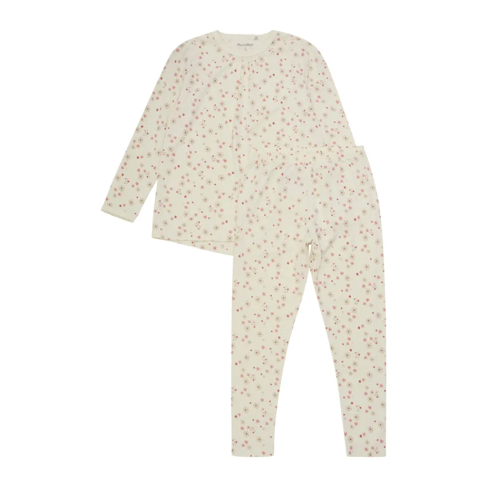 Sødt Minymo nattøj, bestående af en natbluse og natbukser i cremehvid med et fint allover jordbærprint i rød og beige.