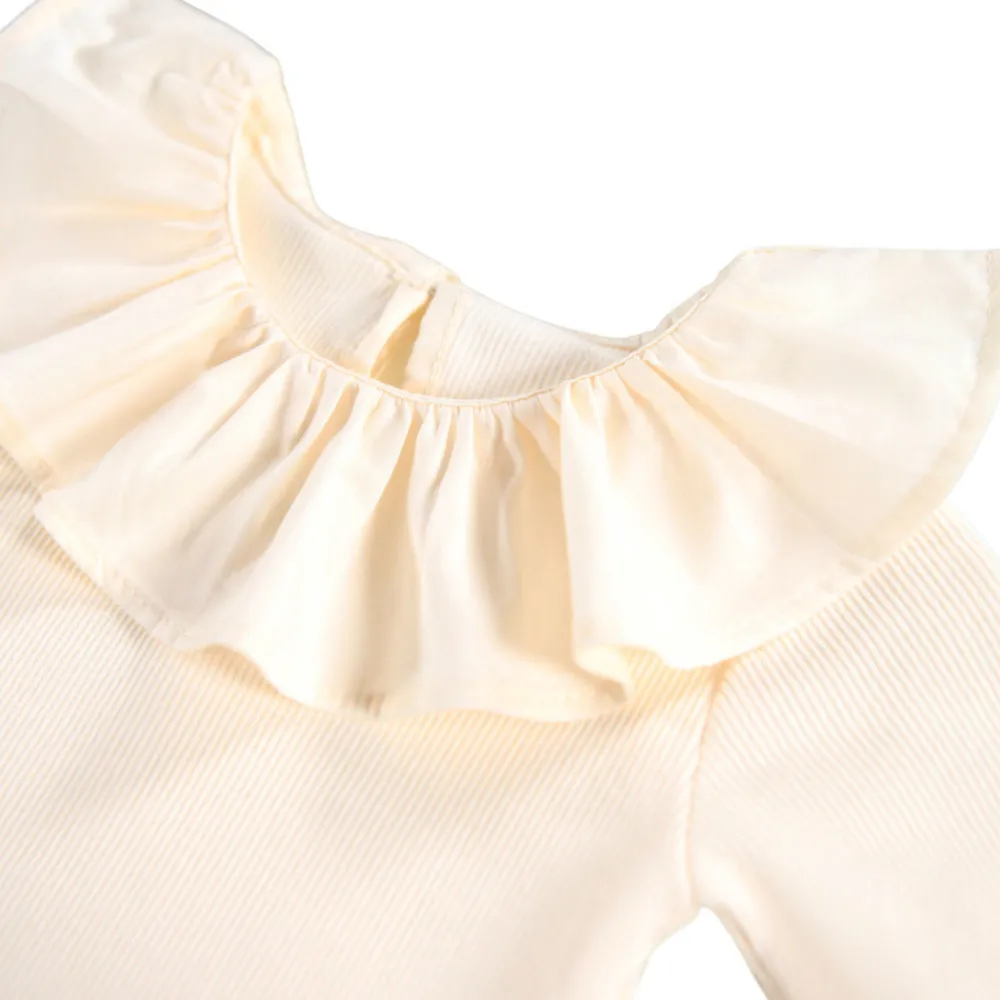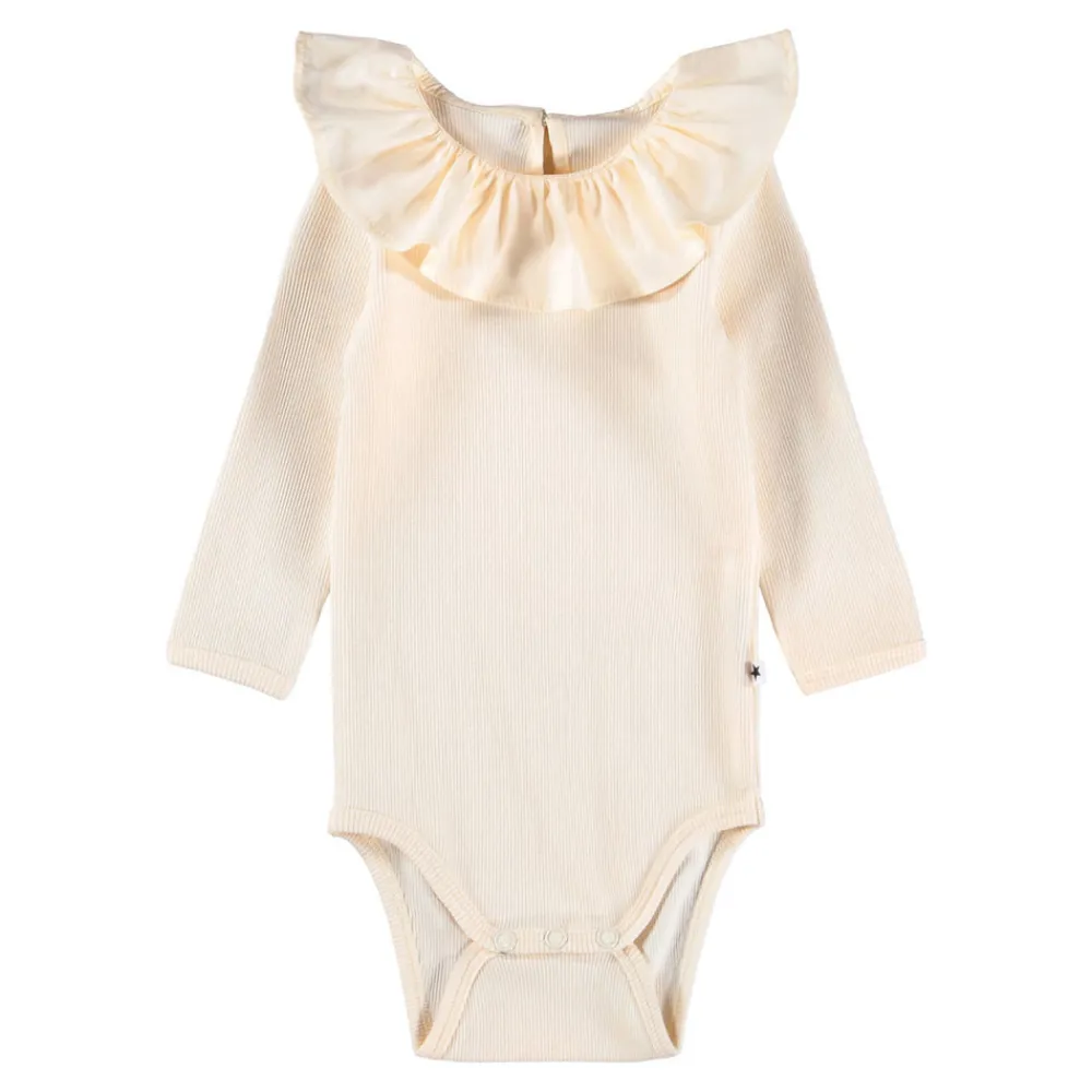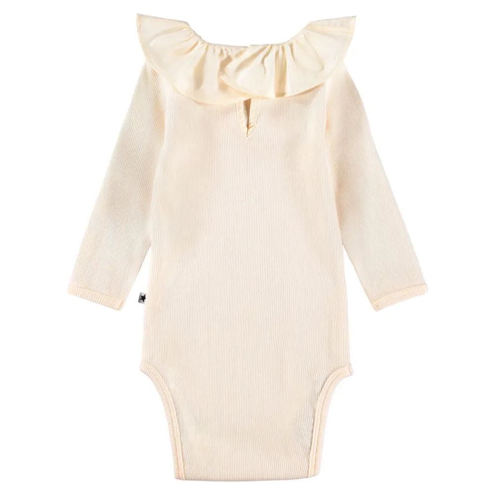 Langærmet bodystocking i ribbet, økologisk bomuld med elegant poplinkrave. Bodyen har knaplukning i ryggen og praktiske trykknapper mellem benene for nem påklædning.
