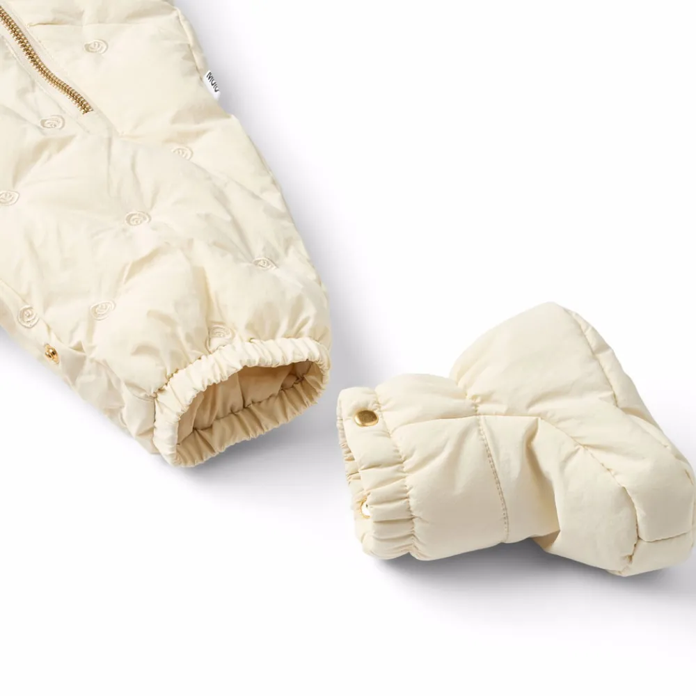 Dragten er foret med blød fleece og har elastik ved ærme- og benåbninger, som hjælper med at holde vanter, sokker og støvler på plads – samtidig med at den beskytter mod vind og vejr. Fyldet er lavet af genanvendt polyester, som giver en jævn, blød varmeisolering. Overfladen er vandafvisende og fri for skadelige stoffer som PFOS og PFOA.
